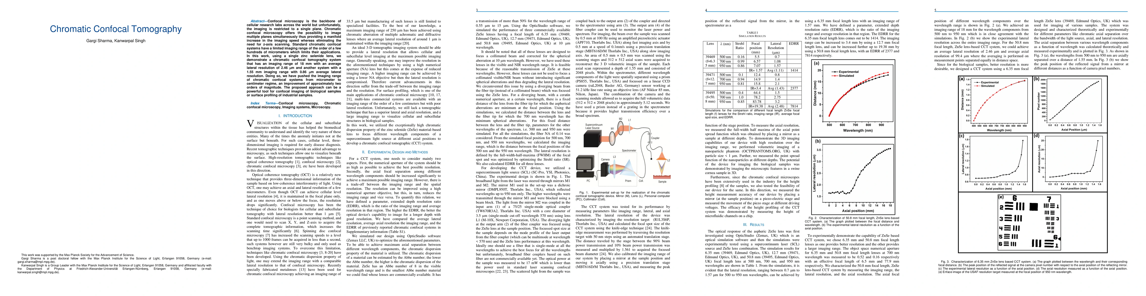 This paper introduces chromatic confocal tomography, which enhances confocal microscopy by imaging multiple planes simultaneously and significantly extends its imaging range from micrometers to centimeters, thus vastly improving imaging speed and resolution for both biological and industrial applications.