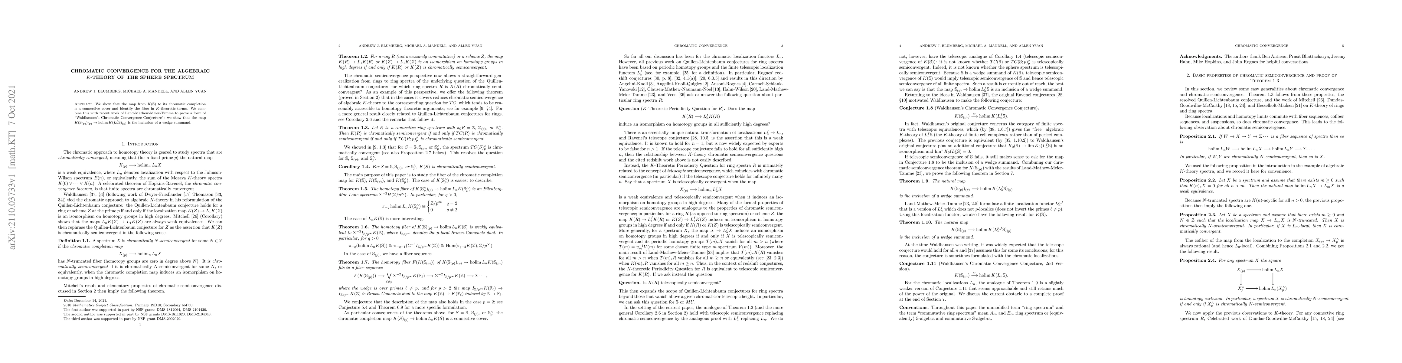 We show that the map from $K({\mathbb S})$ to its chromatic completion is a connective cover and identify the fiber in $K$-theoretic terms. We combine this with recent work of Land-Mathew-Meier-Tamme to prove a form of "Waldhausen's Chromatic Convergence Conjecture": we show that the map $K({\mathbb S}_{(p)})_{(p)}\to \mathop{\rm holim} K(L^{f}_{n}{\mathbb S})_{(p)}$ is the inclusion of a wedge summand.