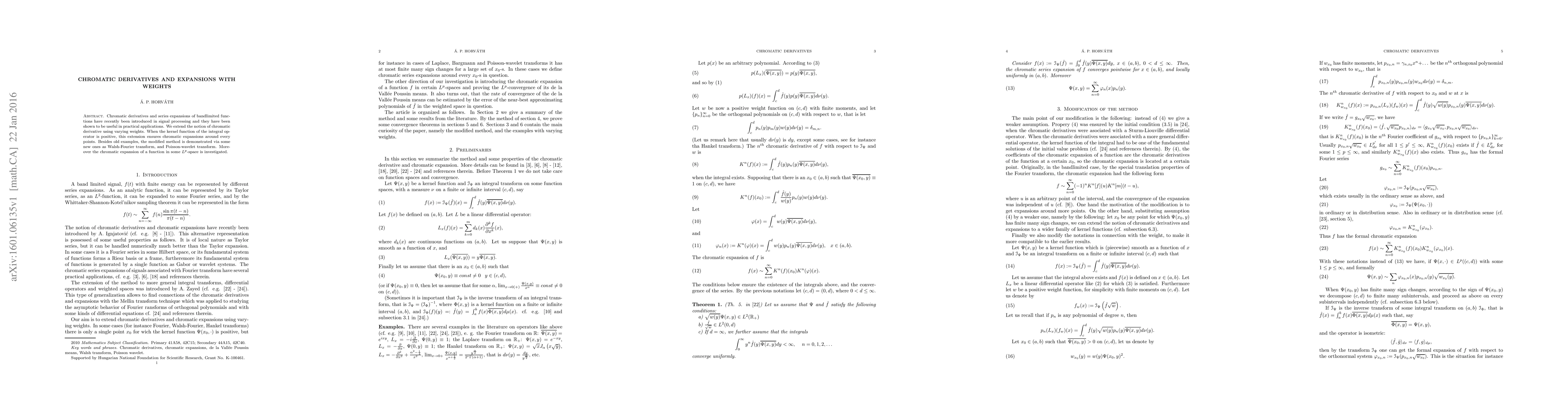 Chromatic derivatives and series expansions of bandlimited functions have recently been introduced in signal processing and they have been shown to be useful in practical applications. We extend the notion of chromatic derivative using varying weights. When the kernel function of the integral operator is positive, this extension ensures chromatic expansions around every points. Besides old examples, the modified method is demonstrated via some new ones as Walsh-Fourier transform, and Poisson-wavelet transform. Moreover the chromatic expansion of a function in some $L^p$-space is investigated.