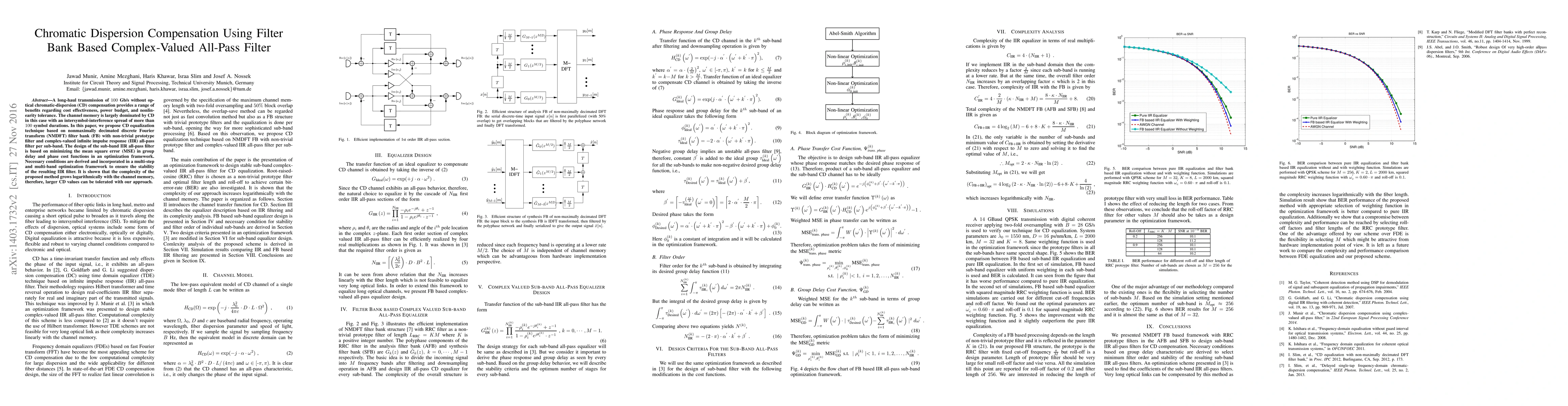 This paper proposes a chromatic dispersion compensation technique using a filter bank with non-trivial prototype filters and complex-valued infinite impulse response all-pass filters. The method optimizes the filters to minimize mean square error in group delay and phase, ensuring stability and logarithmic complexity growth.