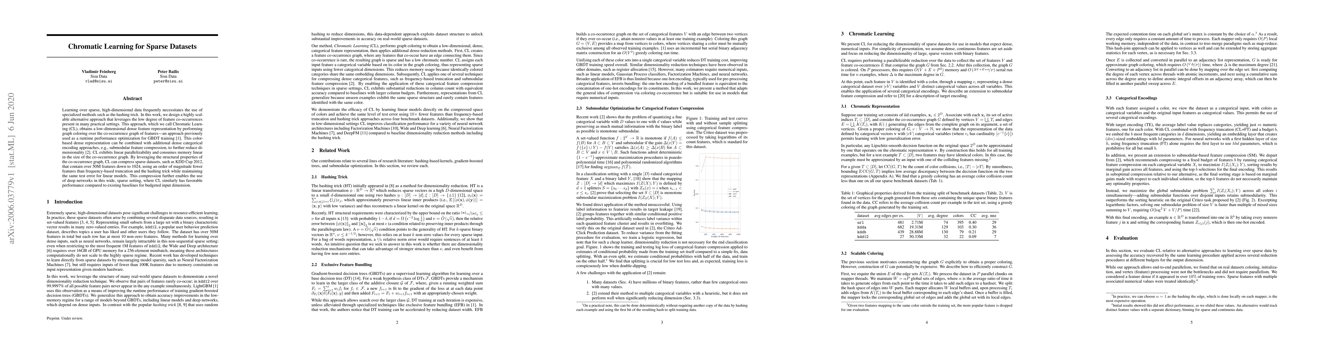A new approach called Chromatic Learning (CL) reduces dimensionality of sparse datasets by coloring a graph representing feature co-occurrences, requiring less features than traditional methods while maintaining similar test error.