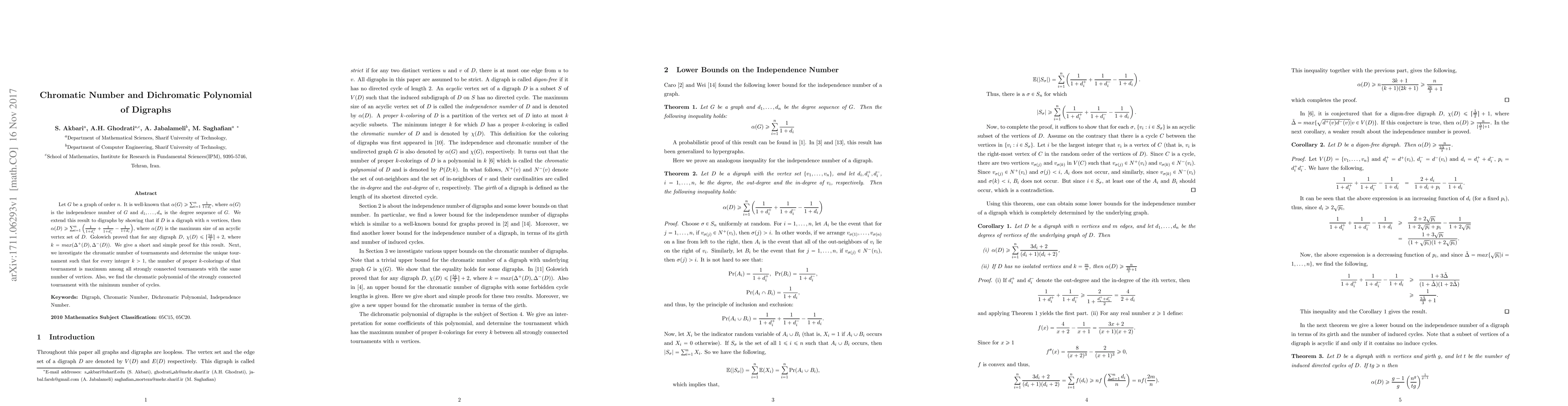This paper extends the independence number result for graphs to digraphs, proving a new inequality involving the maximum size of an acyclic vertex set. It also provides a simplified proof of Golowich's chromatic number bound for digraphs and investigates the chromatic number and dichromatic polynomial of tournaments, identifying a unique tournament with maximal proper k-colorings and determining the chromatic polynomial of a tournament with minimal cycles.