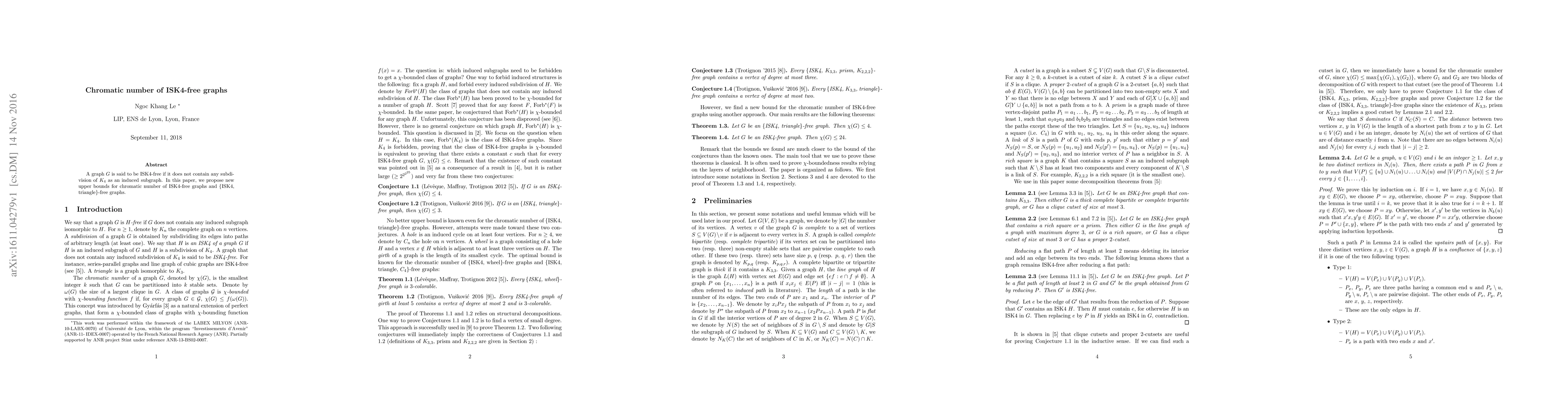 This paper proposes new upper bounds for the chromatic number of ISK4-free graphs and graphs that are both ISK4-free and triangle-free, focusing on the absence of specific induced subgraphs. The findings contribute to the understanding of graph coloring in these restricted graph classes.
