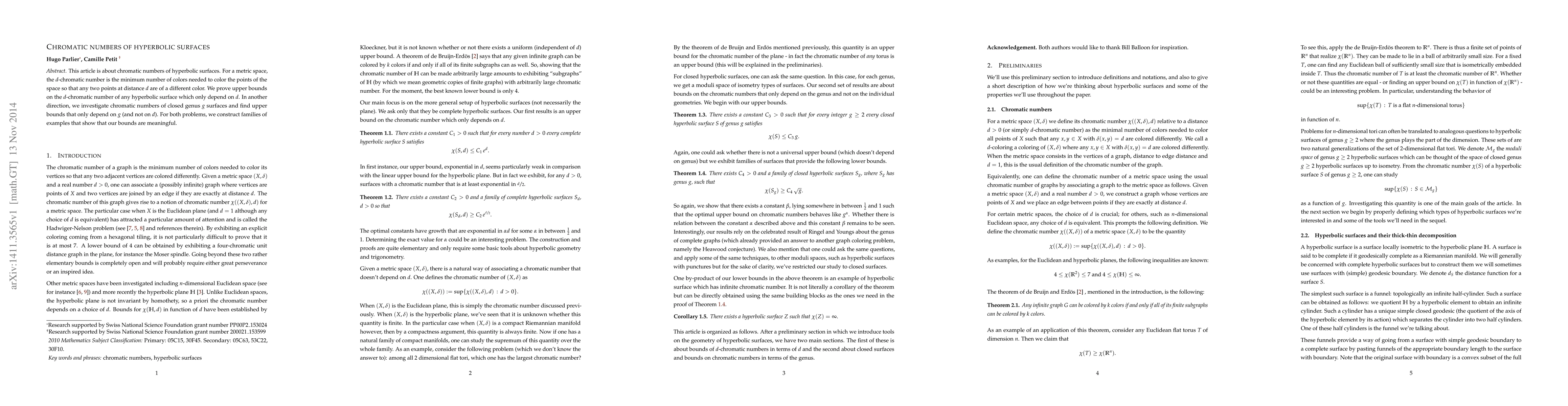This paper establishes upper bounds on the $d$-chromatic number of hyperbolic surfaces that depend solely on $d$, and on the chromatic numbers of closed genus $g$ surfaces that depend only on $g$. It also provides examples demonstrating the significance of these bounds.