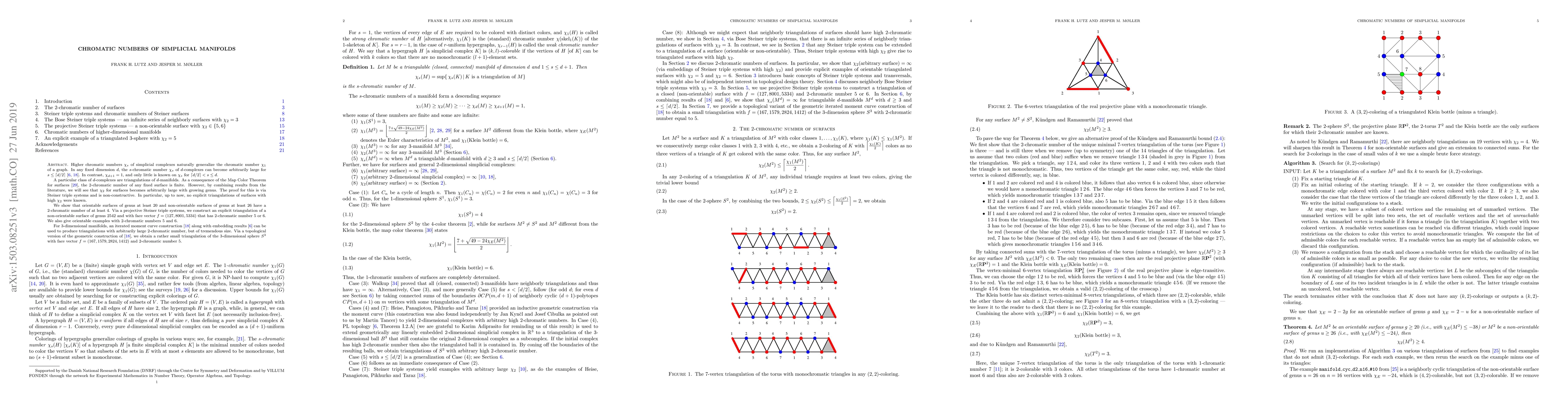 This paper explores the chromatic numbers of simplicial complexes, particularly focusing on triangulations of manifolds. It demonstrates that the 2-chromatic number of surfaces can grow arbitrarily large with increasing genus, providing explicit constructions for high chromatic numbers in both orientable and non-orientable surfaces. Additionally, it presents a small triangulation of the 3-dimensional sphere with a large 2-chromatic number.