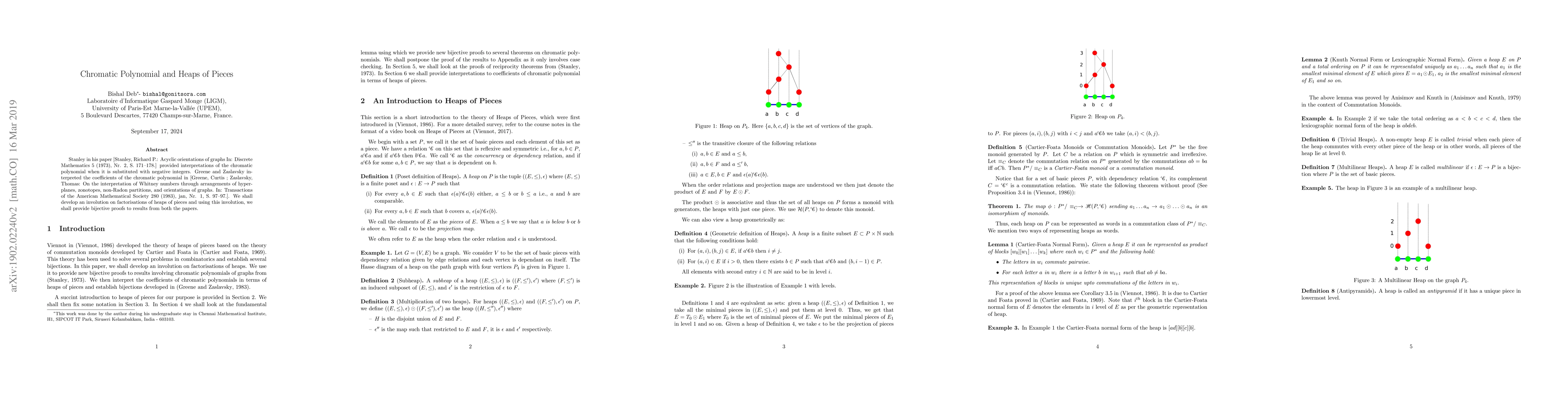 Stanley in his paper [Stanley, Richard P.: Acyclic orientations of graphs In: Discrete Mathematics 5 (1973), Nr. 2, S. 171-178.] provided interpretations of the chromatic polynomial when it is substituted with negative integers. Greene and Zaslavsky interpreted the coefficients of the chromatic polynomial in [Greene, Curtis ; Zaslavsky, Thomas: On the interpretation of Whitney numbers through arrangements of hyperplanes, zonotopes, non-Radon partitions, and orientations of graphs. In: Transactions of the American Mathematical Society 280 (1983), jan, Nr. 1, S. 97-97.]. We shall develop an involution on factorisations of heaps of pieces and using this involution, we shall provide bijective proofs to results from both the papers.