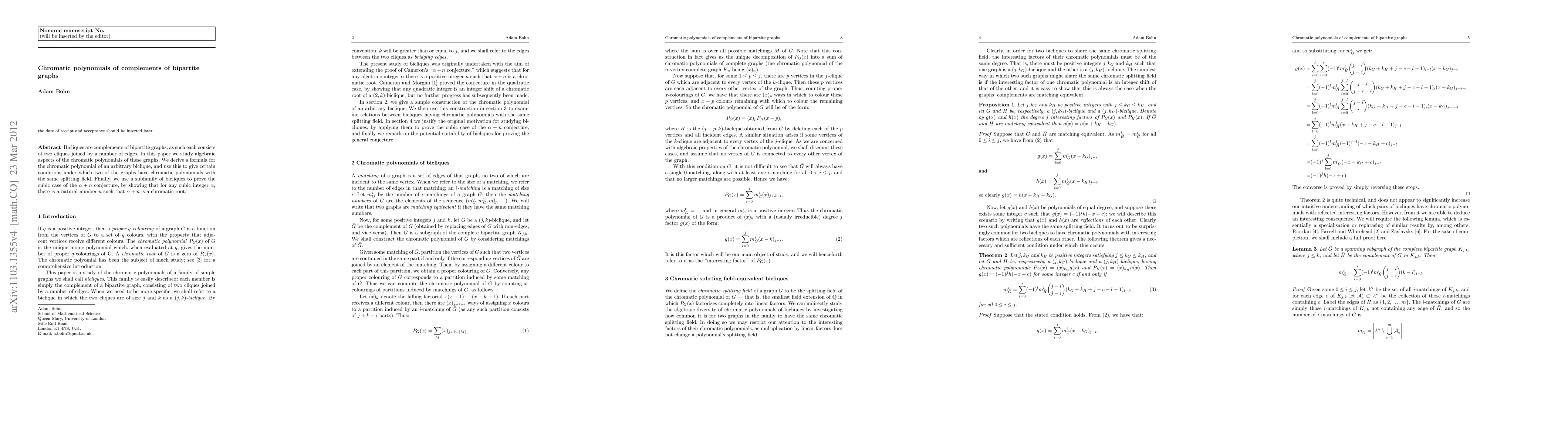 Bicliques are complements of bipartite graphs; as such each consists of two cliques joined by a number of edges. In this paper we study algebraic aspects of the chromatic polynomials of these graphs. We derive a formula for the chromatic polynomial of an arbitrary biclique, and use this to give certain conditions under which two of the graphs have chromatic polynomials with the same splitting field. Finally, we use a subfamily of bicliques to prove the cubic case of the $\alpha +n$ conjecture, by showing that for any cubic integer $\alpha$, there is a natural number $n$ such that $\alpha +n$ is a chromatic root.