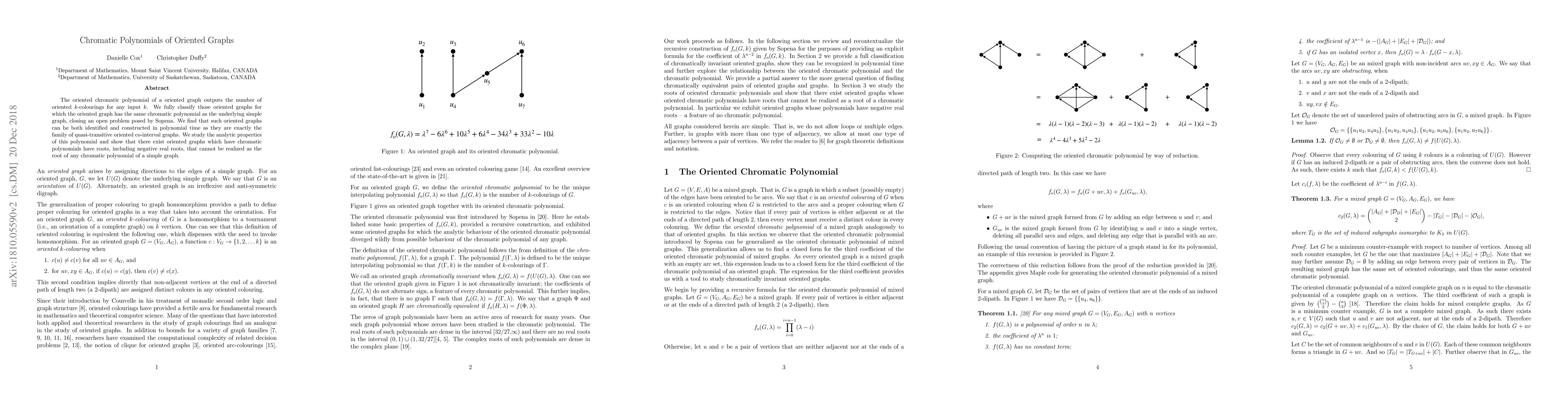 The paper classifies oriented graphs with identical oriented and simple graph chromatic polynomials, identifying them as quasi-transitive oriented co-interval graphs. It also demonstrates that some oriented graphs possess chromatic polynomial roots, including negative real roots, not found in simple graph chromatic polynomials.