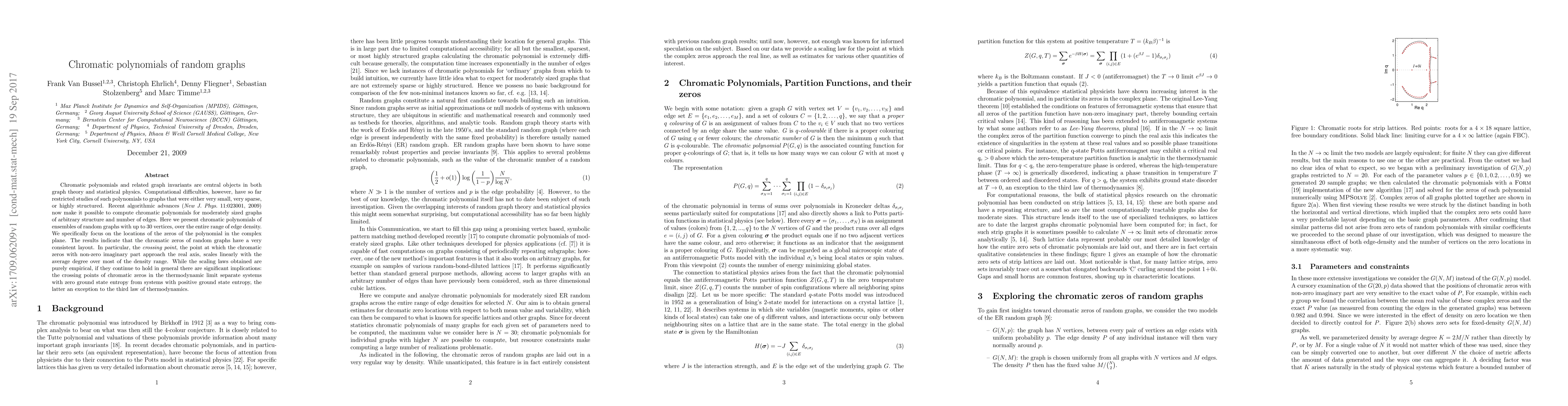 Chromatic polynomials and related graph invariants are central objects in both graph theory and statistical physics. Computational difficulties, however, have so far restricted studies of such polynomials to graphs that were either very small, very sparse or highly structured. Recent algorithmic advances (Timme et al 2009 New J. Phys. 11 023001) now make it possible to compute chromatic polynomials for moderately sized graphs of arbitrary structure and number of edges. Here we present chromatic polynomials of ensembles of random graphs with up to 30 vertices, over the entire range of edge density. We specifically focus on the locations of the zeros of the polynomial in the complex plane. The results indicate that the chromatic zeros of random graphs have a very consistent layout. In particular, the crossing point, the point at which the chromatic zeros with non-zero imaginary part approach the real axis, scales linearly with the average degree over most of the density range. While the scaling laws obtained are purely empirical, if they continue to hold in general there are significant implications: the crossing points of chromatic zeros in the thermodynamic limit separate systems with zero ground state entropy from systems with positive ground state entropy, the latter an exception to the third law of thermodynamics.