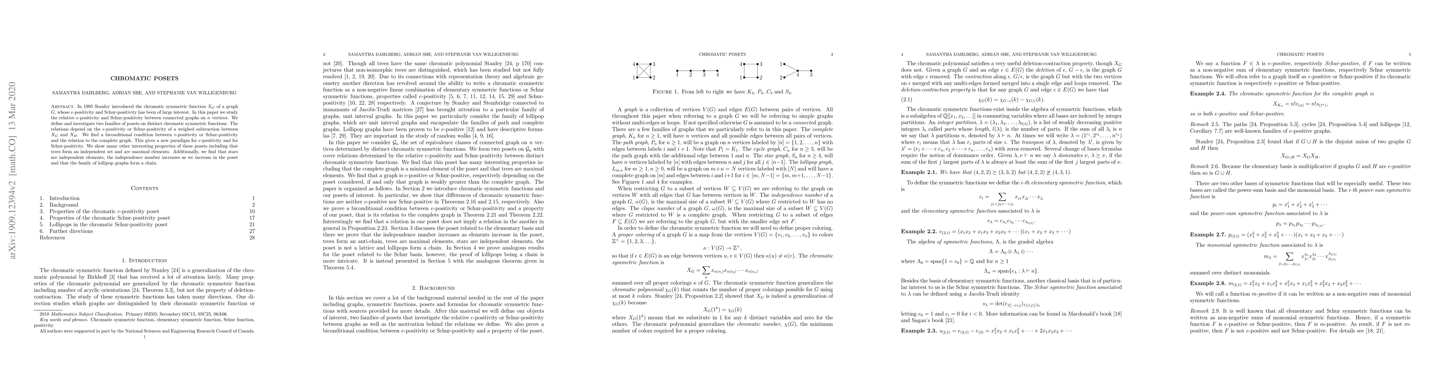 The paper introduces novel poset structures based on chromatic symmetric functions, linking graph properties to poset relations, and establishes conditions for $e$-positivity and Schur-positivity.