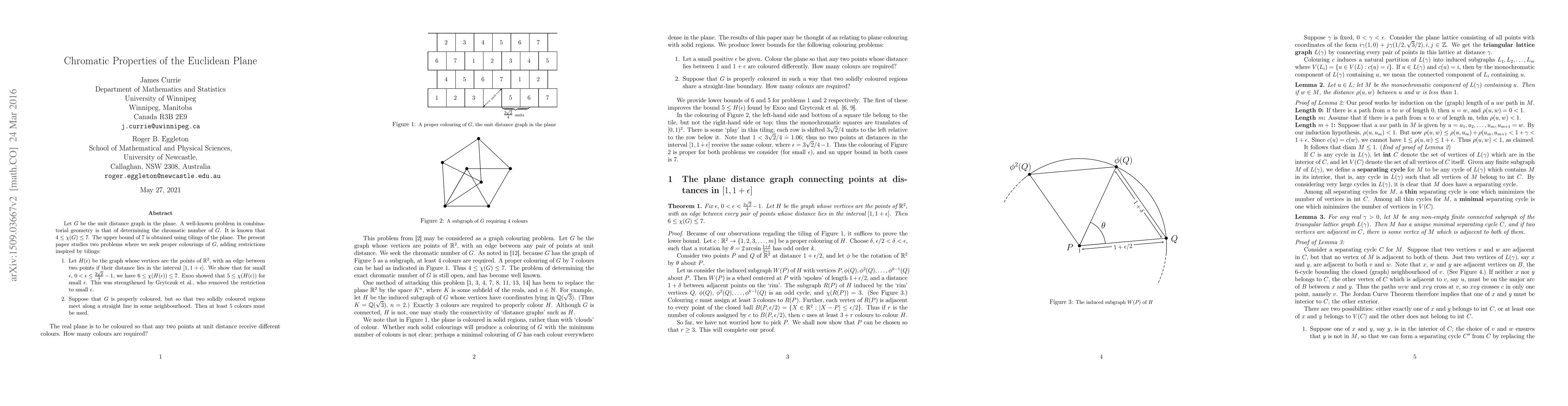 Let $G$ be the unit distance graph in the plane. A well-known problem in combinatorial geometry is that of determining the chromatic number of $G$. It is known that $4\le \chi(G)\le 7$. The upper bound of 7 is obtained using tilings of the plane. The present paper studies two problems where we seek proper colourings of $G$, adding restrictions inspired by tilings: Let $H(\epsilon)$ be the graph whose vertices are the points of ${\mathbb R}^2$, with an edge between two points if their distance lies in the interval $[1,1+\epsilon]$. We show that for small $\epsilon$, $0<\epsilon\le \frac{3\sqrt{2}}{4}-1$, we have $6\le \chi(H(\epsilon))\le 7$. This improves the result of Exoo and Grytczuk et al. that $5\le \chi(H(\epsilon))$ for small $\epsilon$. Suppose that $G$ is properly coloured, but so that two solidly coloured regions meet along a straight line in some neighbourhood. Then at least 5 colours must be used.