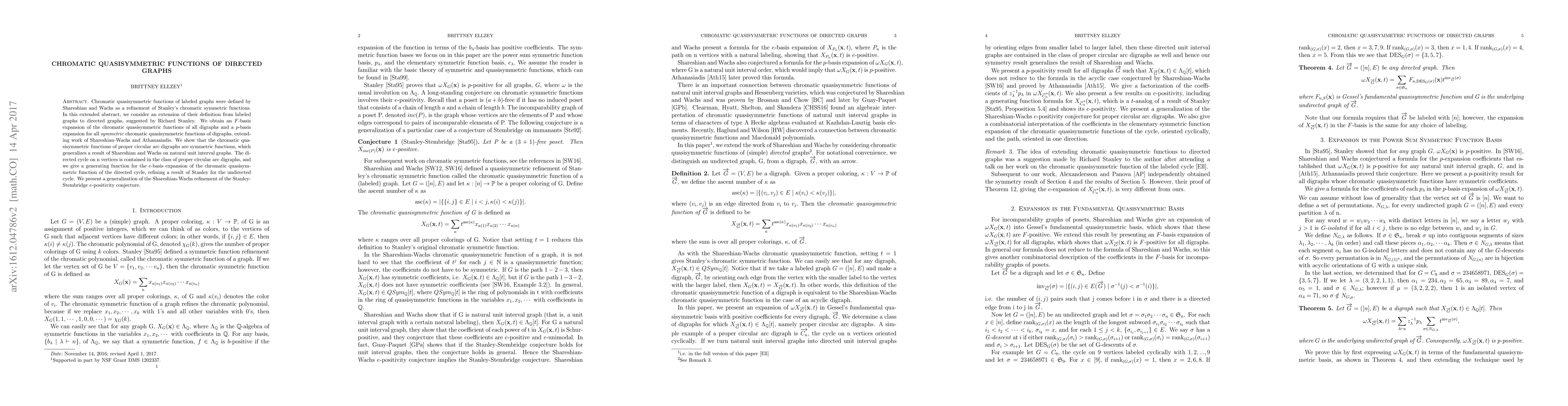 Chromatic quasisymmetric functions of labeled graphs were defined by Shareshian and Wachs as a refinement of Stanley's chromatic symmetric functions. In this extended abstract, we consider an extension of their definition from labeled graphs to directed graphs, suggested by Richard Stanley. We obtain an F-basis expansion of the chromatic quasisymmetric functions of all digraphs and a p-basis expansion for all symmetric chromatic quasisymmetric functions of digraphs, extending work of Shareshian-Wachs and Athanasiadis. We show that the chromatic quasisymmetric functions of proper circular arc digraphs are symmetric functions, which generalizes a result of Shareshian and Wachs on natural unit interval graphs. The directed cycle on n vertices is contained in the class of proper circular arc digraphs, and we give a generating function for the e-basis expansion of the chromatic quasisymmetric function of the directed cycle, refining a result of Stanley for the undirected cycle. We present a generalization of the Shareshian-Wachs refinement of the Stanley-Stembridge e-positivity conjecture.
