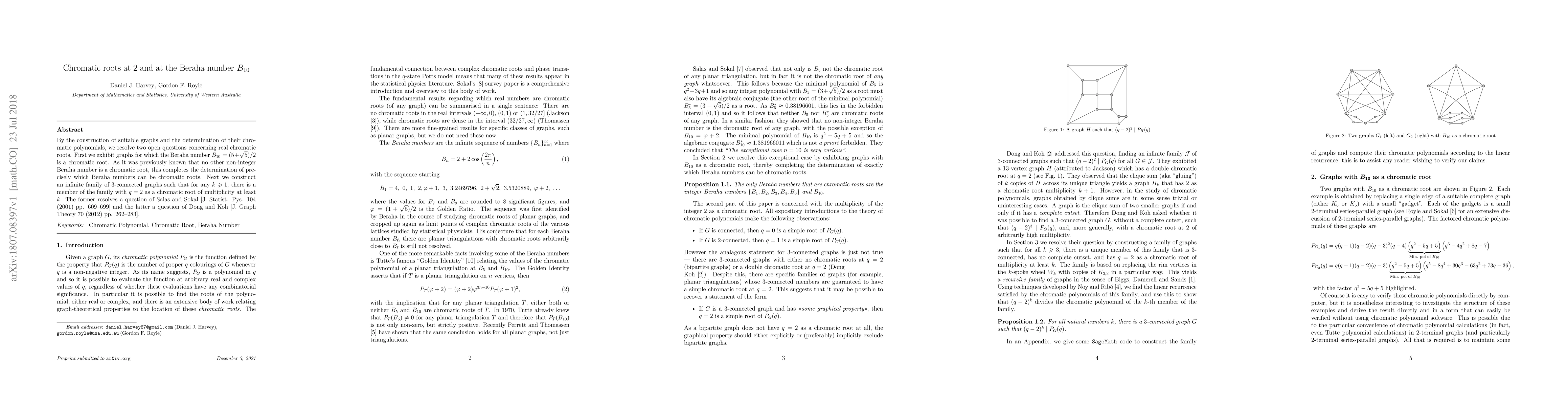 This paper resolves open questions about real chromatic roots by constructing graphs whose chromatic polynomials exhibit the Beraha number $B_{10}$ and $q=2$ as roots, thereby completing the identification of which Beraha numbers can be chromatic roots and demonstrating an infinite family of graphs with $q=2$ as a chromatic root of arbitrary multiplicity.