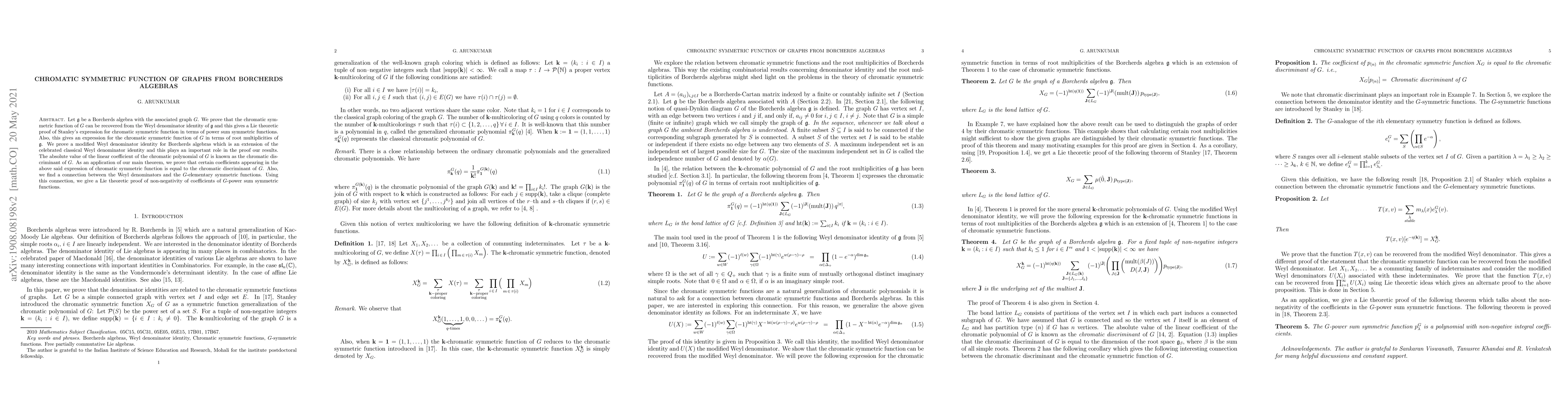 Let $\mathfrak g$ be a Borcherds algebra with the associated graph $G$. We prove that the chromatic symmetric function of $G$ can be recovered from the Weyl denominator identity of $\mathfrak g$ and this gives a Lie theoretic proof of Stanley's expression for chromatic symmetric function in terms of power sum symmetric function. Also, this gives an expression for chromatic symmetric function of $G$ in terms of root multiplicities of $\lie g$. The absolute value of the linear coefficient of the chromatic polynomial of $G$ is known as the chromatic discriminant of $G$. As an application of our main theorem, we prove that graphs with different chromatic discriminants are distinguished by their chromatic symmetric functions. Also, we find a connection between the Weyl denominators and the $G$-elementary symmetric functions. Using this connection, we give a Lie theoretic proof of non-negativity of coefficients of $G$-power sum symmetric functions.