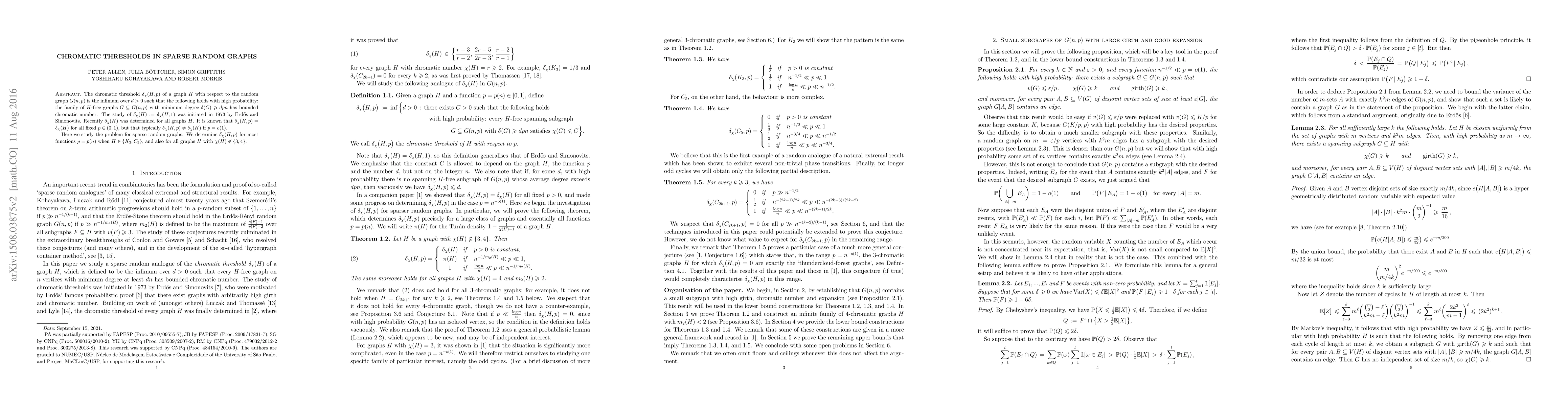 The chromatic threshold $\delta_\chi(H,p)$ of a graph $H$ with respect to the random graph $G(n,p)$ is the infimum over $d > 0$ such that the following holds with high probability: the family of $H$-free graphs $G \subset G(n,p)$ with minimum degree $\delta(G) \ge dpn$ has bounded chromatic number. The study of $\delta_\chi(H) :=\delta_\chi(H,1)$ was initiated in 1973 by Erd\H{o}s and Simonovits. Recently $\delta_\chi(H)$ was determined for all graphs $H$. It is known that $\delta_\chi(H,p) =\delta_\chi(H)$ for all fixed $p \in (0,1)$, but that typically $\delta_\chi(H,p) \ne \delta_\chi(H)$ if $p = o(1)$. Here we study the problem for sparse random graphs. We determine $\delta_\chi(H,p)$ for most functions $p = p(n)$ when $H\in\{K_3,C_5\}$, and also for all graphs $H$ with $\chi(H) \not\in \{3,4\}$.
