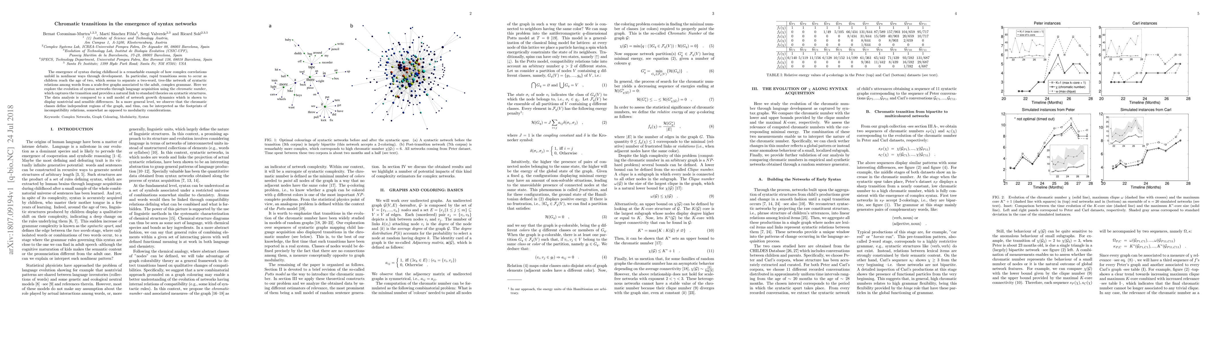 The emergence of syntax during childhood is a remarkable example of how complex correlations unfold in nonlinear ways through development. In particular, rapid transitions seem to occur as children reach the age of two, which seems to separate a two-word, tree-like network of syntactic relations among words from a scale-free graphs associated to the adult, complex grammar. Here we explore the evolution of syntax networks through language acquisition using the {\em chromatic number}, which captures the transition and provides a natural link to standard theories on syntactic structures. The data analysis is compared to a null model of network growth dynamics which is shown to display nontrivial and sensible differences. In a more general level, we observe that the chromatic classes define independent regions of the graph, and thus, can be interpreted as the footprints of incompatibility relations, somewhat as opposed to modularity considerations.