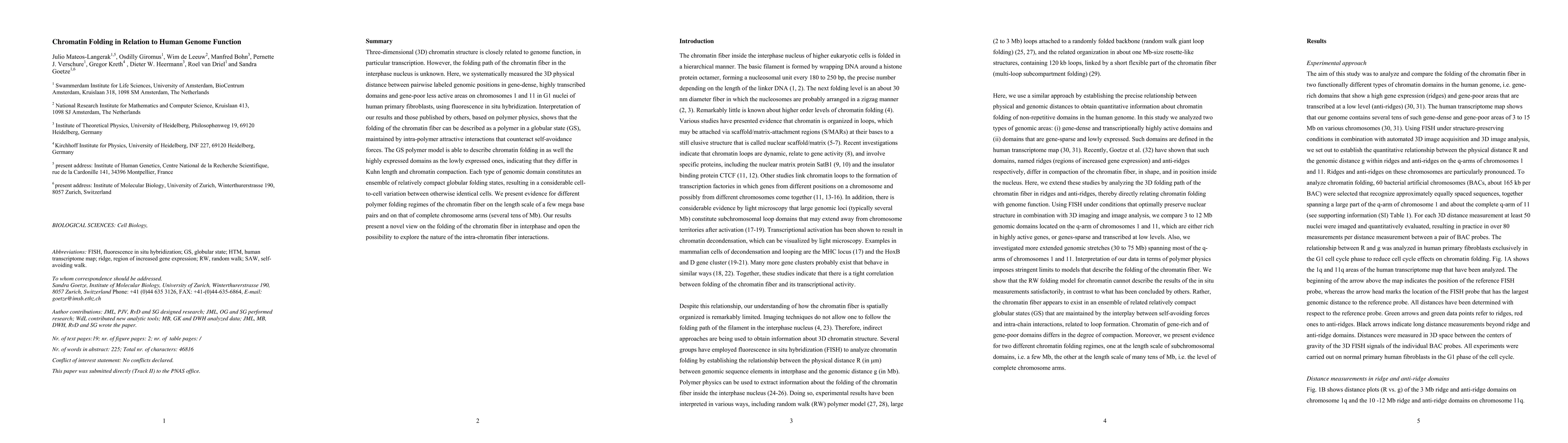Three-dimensional (3D) chromatin structure is closely related to genome function, in particular transcription. However, the folding path of the chromatin fiber in the interphase nucleus is unknown. Here, we systematically measured the 3D physical distance between pairwise labeled genomic positions in gene-dense, highly transcribed domains and gene-poor less active areas on chromosomes 1 and 11 in G1 nuclei of human primary fibroblasts, using fluorescence in situ hybridization. Interpretation of our results and those published by others, based on polymer physics, shows that the folding of the chromatin fiber can be described as a polymer in a globular state (GS), maintained by intra-polymer attractive interactions that counteract self-avoidance forces. The GS polymer model is able to describe chromatin folding in as well the highly expressed domains as the lowly expressed ones, indicating that they differ in Kuhn length and chromatin compaction. Each type of genomic domain constitutes an ensemble of relatively compact globular folding states, resulting in a considerable cellto- cell variation between otherwise identical cells. We present evidence for different polymer folding regimes of the chromatin fiber on the length scale of a few mega base pairs and on that of complete chromosome arms (several tens of Mb). Our results present a novel view on the folding of the chromatin fiber in interphase and open the possibility to explore the nature of the intra-chromatin fiber interactions.