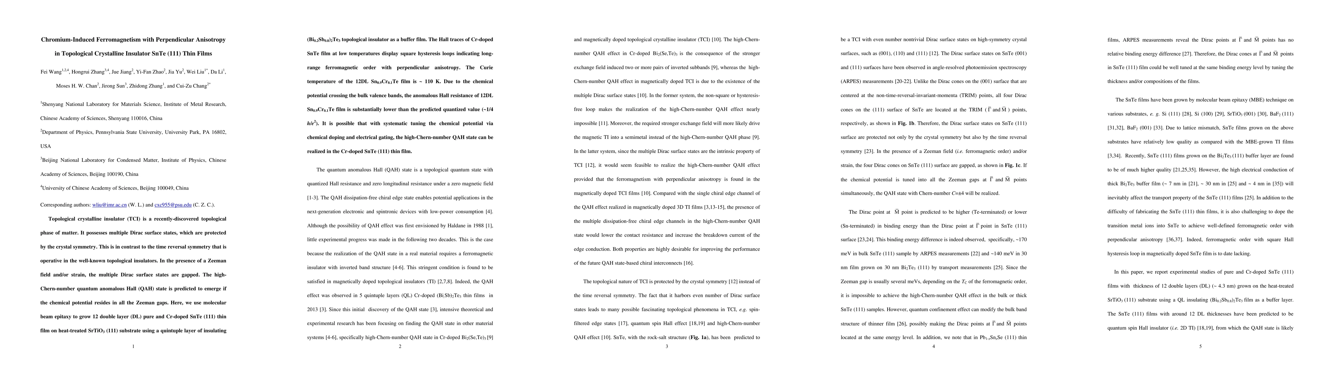 This study reports the growth of Cr-doped SnTe (111) thin films using molecular beam epitaxy, revealing ferromagnetism with perpendicular anisotropy and suggesting the potential to realize a high-Chern-number quantum anomalous Hall state through chemical potential tuning. The Curie temperature for the Cr-doped films is found to be approximately 110 K.