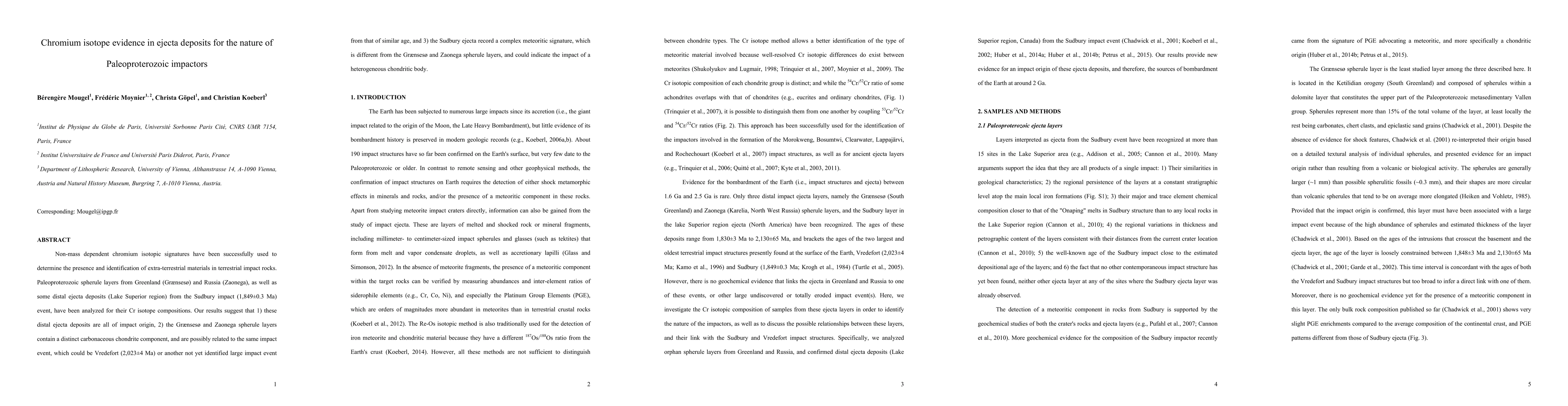 Non-mass dependent chromium isotopic signatures have been successfully used to determine the presence and identification of extra-terrestrial materials in terrestrial impact rocks. Paleoproterozoic spherule layers from Greenland (Graenseso) and Russia (Zaonega), as well as some distal ejecta deposits (Lake Superior region) from the Sudbury impact (1,849 +/- 0.3 Ma) event, have been analyzed for their Cr isotope compositions. Our results suggest that 1) these distal ejecta deposits are all of impact origin, 2) the Graenseso and Zaonega spherule layers contain a distinct carbonaceous chondrite component, and are possibly related to the same impact event, which could be Vredefort (2,023 +/- 4 Ma) or another not yet identified large impact event from that of similar age, and 3) the Sudbury ejecta record a complex meteoritic signature, which is different from the Graenseso and Zaonega spherule layers, and could indicate the impact of a heterogeneous chondritic body.