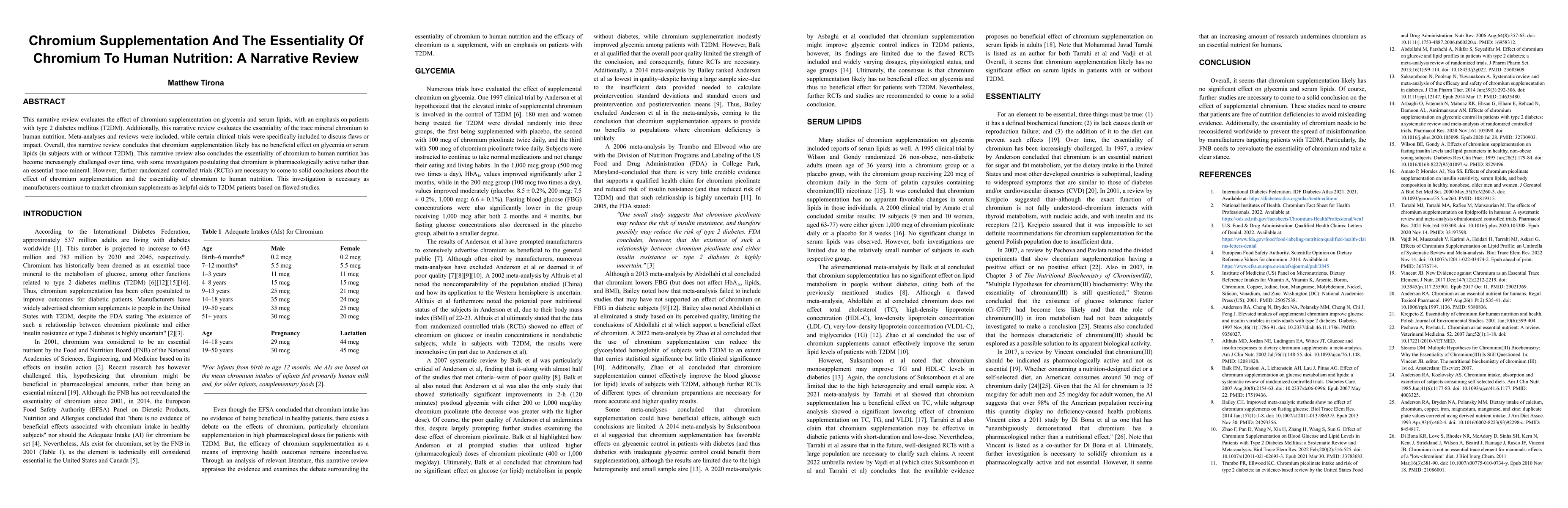 This narrative review evaluates the effect of chromium supplementation on glycemia and serum lipids, with an emphasis on patients with type 2 diabetes mellitus (T2DM). Additionally, this narrative review evaluates the essentiality of the trace mineral chromium to human nutrition. Meta-analyses and reviews were included, while certain clinical trials were specifically included to discuss flaws or impact. Overall, this narrative review concludes that chromium supplementation likely has no beneficial effect on glycemia or serum lipids (in subjects with or without T2DM). This narrative review also concludes the essentiality of chromium to human nutrition has become increasingly challenged over time, with some investigators postulating that chromium is pharmacologically active rather than an essential trace mineral. However, further randomized controlled trials (RCTs) are necessary to come to solid conclusions about the effect of chromium supplementation and the essentiality of chromium to human nutrition. This investigation is necessary as manufacturers continue to market chromium supplements as helpful aids to T2DM patients based on flawed studies.
