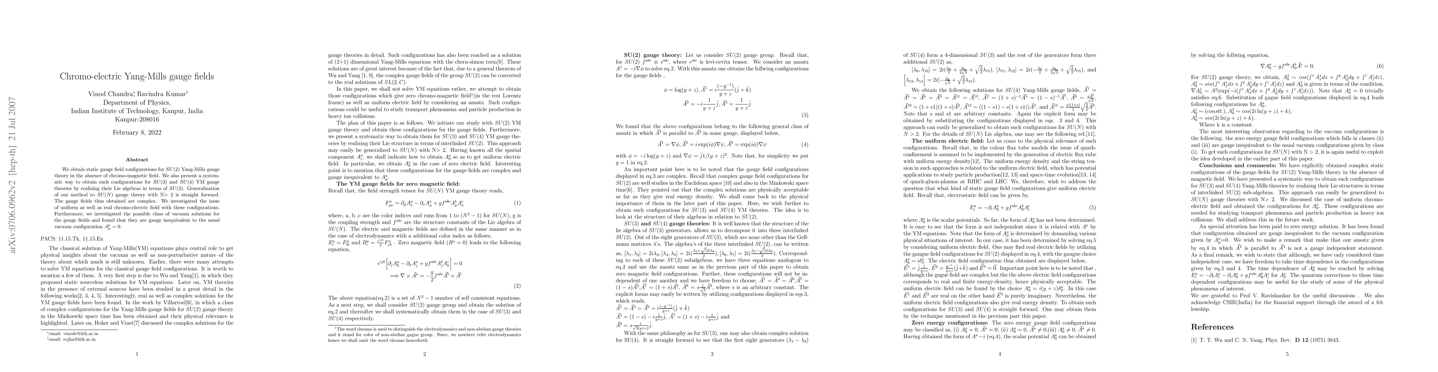 This paper presents static gauge field configurations for SU(2) Yang-Mills theory without chromo-magnetic fields and extends the method to SU(3) and SU(4) gauge theories by embedding their Lie algebras in SU(2). The obtained complex gauge fields are analyzed for uniform and real chromo-electric fields, revealing gauge inequivalent vacuum solutions distinct from the usual $A^a_{\mu}=0$ configuration.