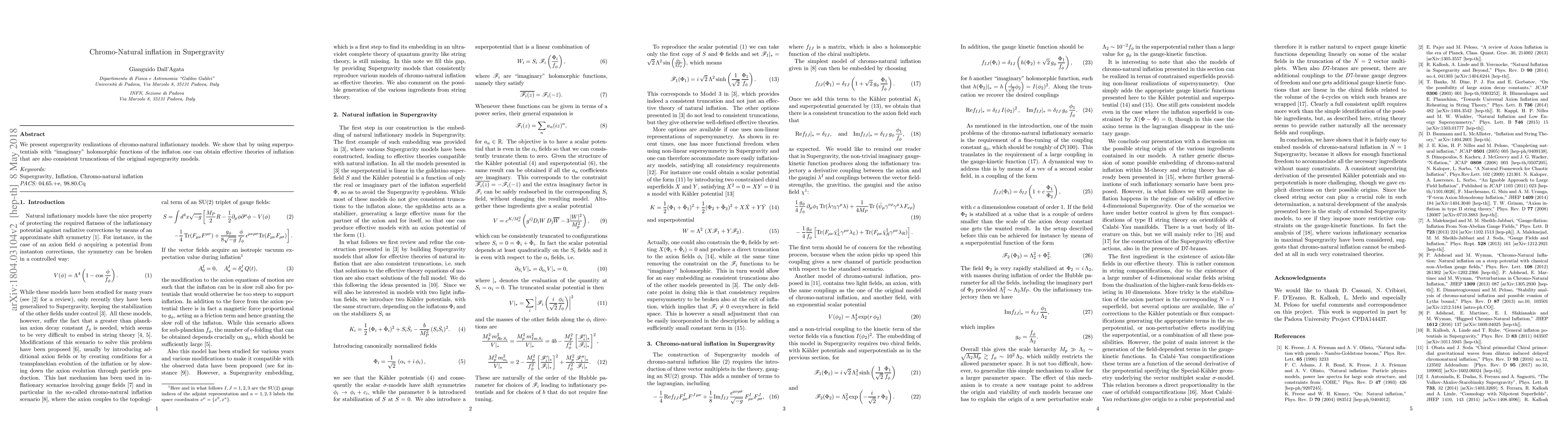 Summary: This paper explores supergravity implementations of chromo-natural inflation, demonstrating that "imaginary" holomorphic functions of the inflaton yield effective inflationary models that remain consistent with the original supergravity frameworks.