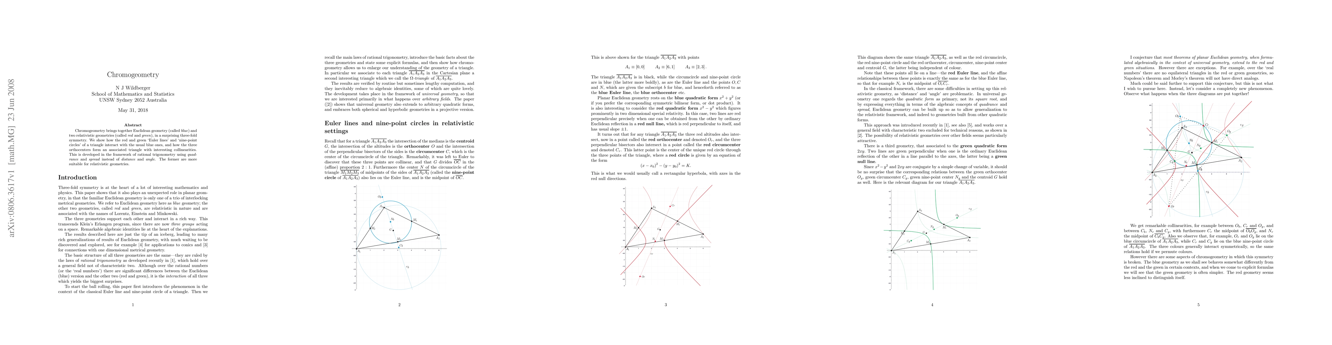 Chromogeometry integrates Euclidean geometry with two relativistic geometries, revealing a three-fold symmetry through interactions of their respective Euler lines and nine-point circles. This framework employs quadrance and spread for a more relativistically suitable analysis, highlighting collinearities among associated triangles' orthocenters.