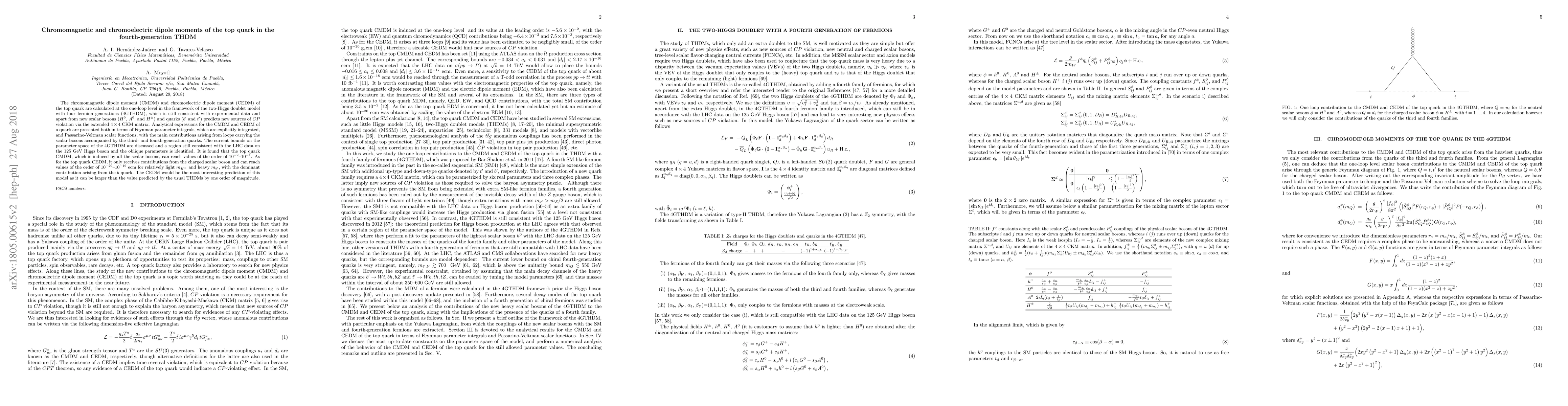 This research calculates the chromo magnetic dipole moment (CMDM) and chromo electric dipole moment (CEDM) of the top quark at one-loop level in the 4GTHDM, predicting values up to $10^{-4}$-$10^{-3}$ for CMDM, mainly from fourth generation quarks, and up to $10^{-19}$-$10^{-18}$ ecm for CEDM, from charged scalar boson loops involving the heavy b' quark. The 4GTHDM remains consistent with LHC data on the 125 GeV Higgs boson.