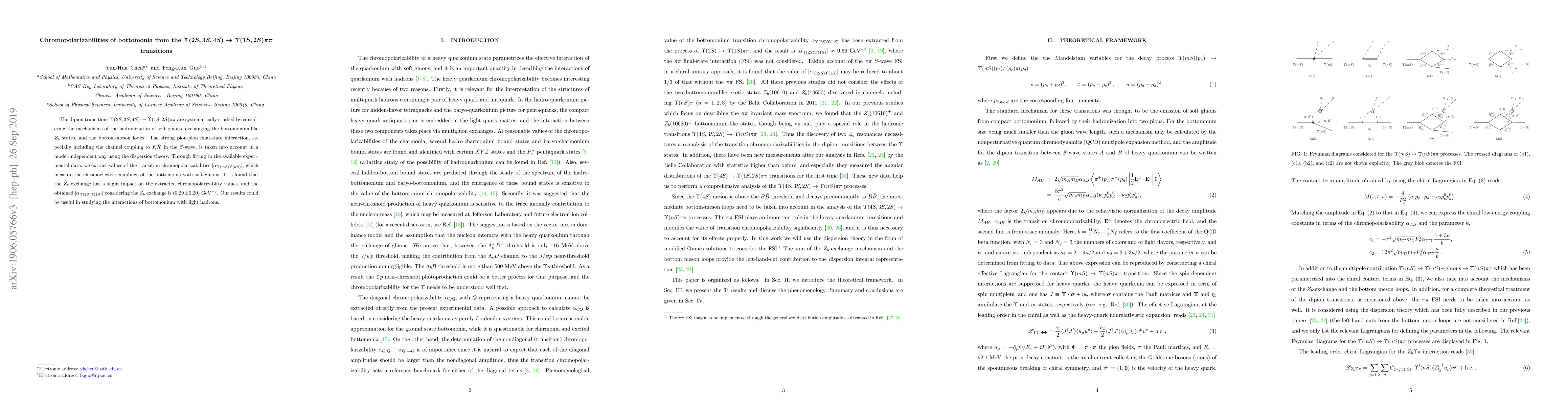 This paper investigates the dipion transitions of bottomonia, focusing on chromopolarizabilities extracted from $\Upsilon(2S,3S,4S) \to \Upsilon(1S,2S)\pi\pi$ transitions. It considers various hadronization mechanisms and uses dispersion theory to account for strong pion-pion interactions, ultimately finding $|\alpha_{\Upsilon(2S)\Upsilon(1S)}|$ to be $(0.29\pm 0.20)~\text{GeV}^{-3}$, with slight influence from $Z_b$ exchange.