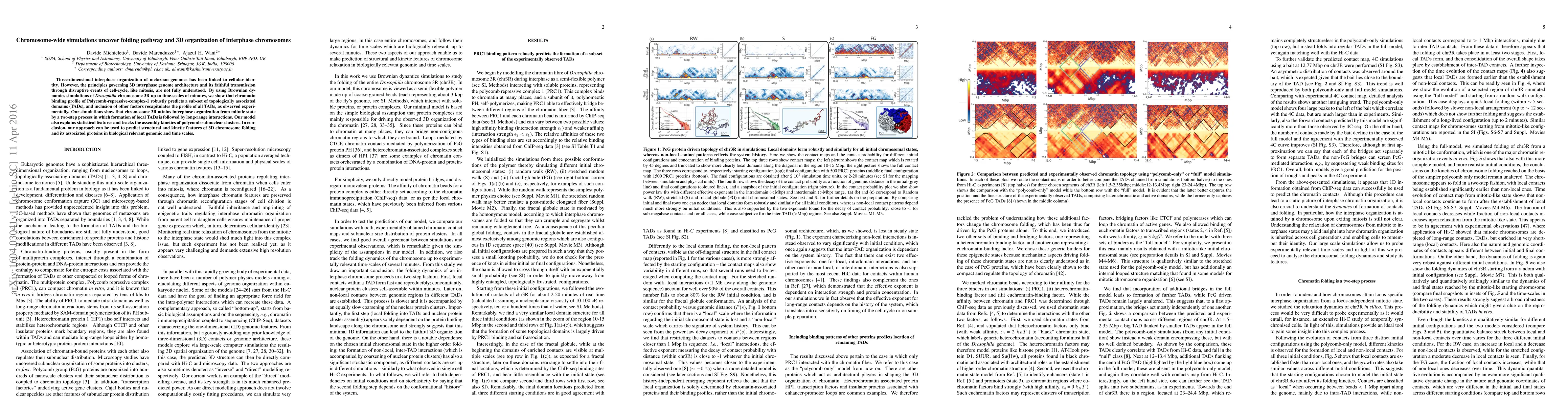 This research uses chromosome-wide simulations to elucidate the folding pathway and 3D organization of interphase chromosomes, revealing a two-step process from mitotic to interphase organization involving local TAD formation followed by long-range interactions. The study demonstrates how chromatin binding profiles predict topologically associated domains and can predict structural and kinetic features of chromosome folding.