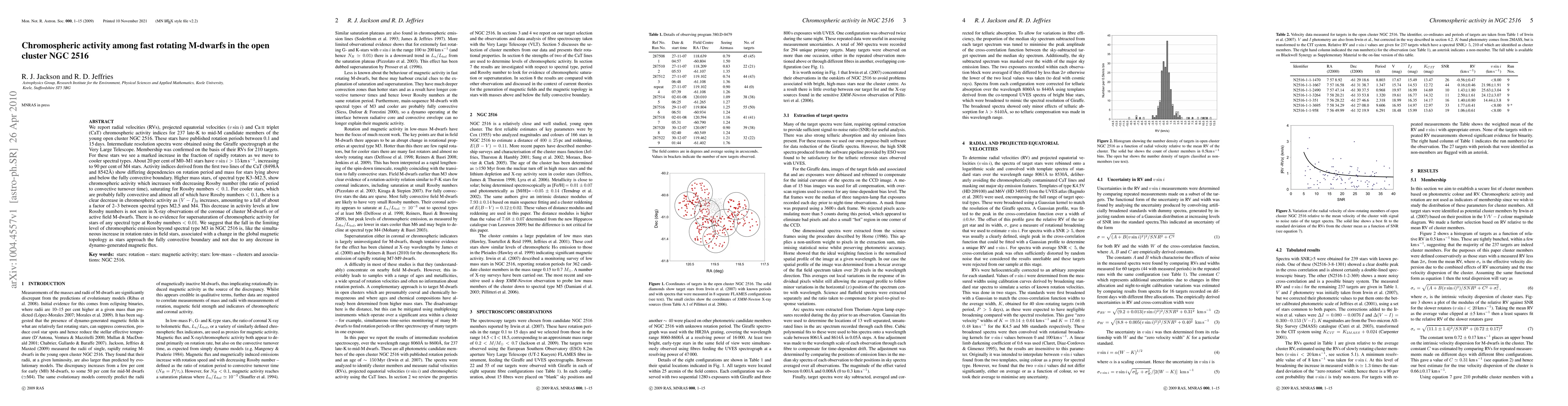 We report radial velocities (RVs), projected equatorial velocities (v sin i) and CaII triplet (CaT) chromospheric activity indices for 237 late-K to mid-M candidate members of the young open cluster NGC 2516. These stars have rotation periods between 0.1 and 15 days. Intermediate resolution spectra were obtained using the Giraffe spectrograph at the Very Large Telescope. Membership was confirmed on the basis of RVs for 210 targets. We see a marked increase in the fraction of rapidly rotators as we move to cooler spectral types. About 20 per cent of M0-M1 stars have v sin i >15km/s, increasing to 90 per cent of M4 stars. Activity indices derived from the first two lines of the CaT (8498A and 8542A) show differing dependencies on rotation period and mass for stars lying above and below the fully convective boundary. Higher mass stars, of spectral type K3-M2.5, show chromospheric activity which increases with decreasing Rossby number (the ratio of period to convective turnover time), saturating for Rossby numbers <0.1. For cooler stars, which are probably fully convective and almost all of which have Rossby numbers <0.1, there is a clear decrease in chromospheric activity as (V-I)_0 increases, amounting to a fall of about a factor of 2-3 between spectral types M2.5 and M4. This decrease in activity levels at low Rossby numbers is not seen in X-ray observations of the coronae of cluster M-dwarfs or of active field M-dwarfs. There is no evidence for supersaturation of chromospheric activity for stars of any spectral type at Rossby numbers <0.01. We suggest that the fall in the limiting level of chromospheric emission beyond spectral type M3 in NGC~2516 is, like the simultaneous increase in rotation rates in field stars, associated with a change in the global magnetic topology as stars approach the fully convective boundary and not due to any decrease in dynamo-generated magnetic flux.