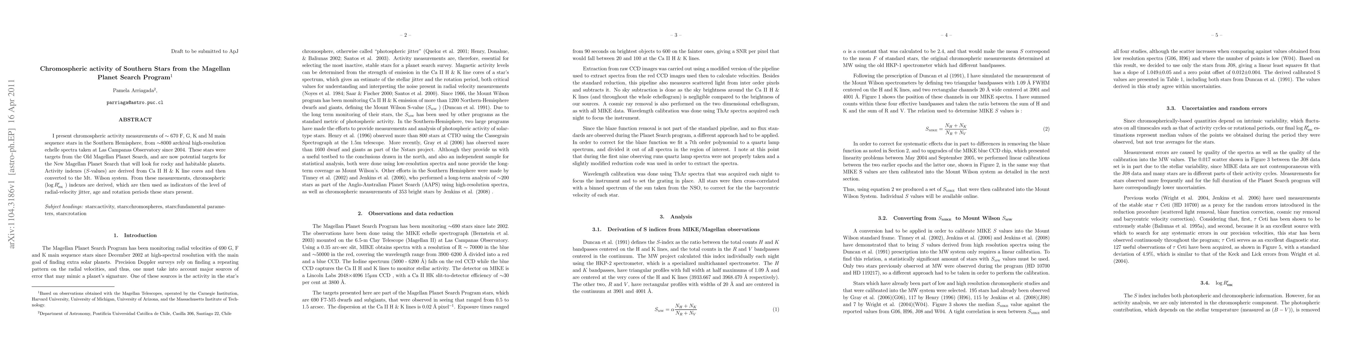 This study measures chromospheric activity in ~670 F, G, K, and M stars in the Southern Hemisphere using archival high-resolution spectra from the Magellan Planet Search program. The derived activity indexes (logrhk) serve as indicators of radial-velocity jitter, age, and rotation periods, aiding future planet search efforts.