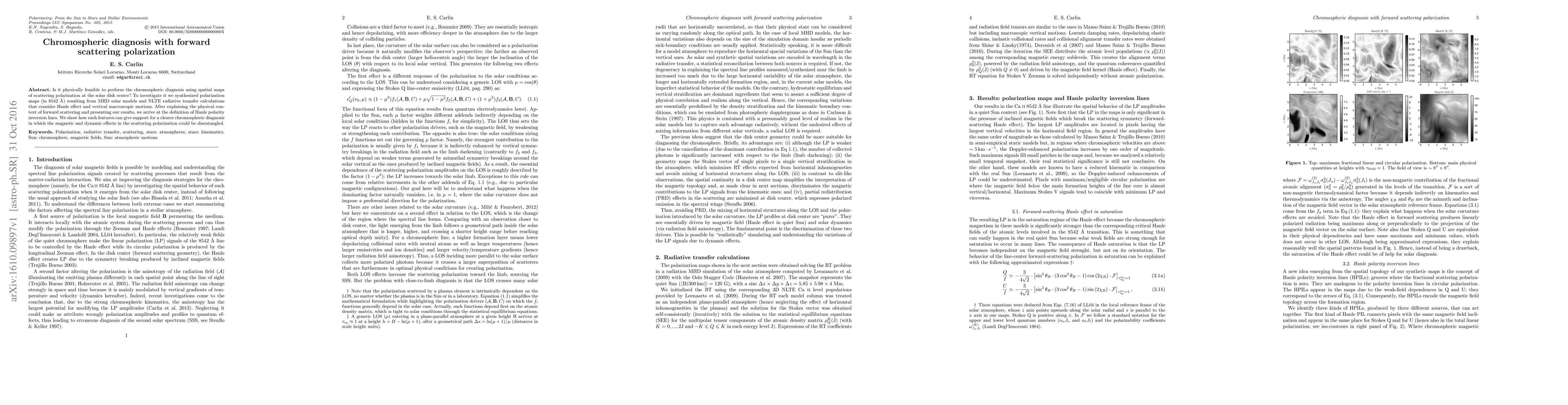 Is it physically feasible to perform chromospheric diagnosis using spatial maps of scattering polarization at the solar disk center? To investigate it we synthesized polarization maps (in 8542 Angstroms) resulting from MHD solar models and NLTE radiative transfer calculations that consider Hanle effect and vertical macroscopic motions. After explaining the physical con- text of forward scattering and presenting our results, we arrive at the definition of Hanle polarity inversion lines. We show how such features can give support for a clearer chromospheric diagnosis in which the magnetic and dynamic effects in the scattering polarization could be disentangled.
