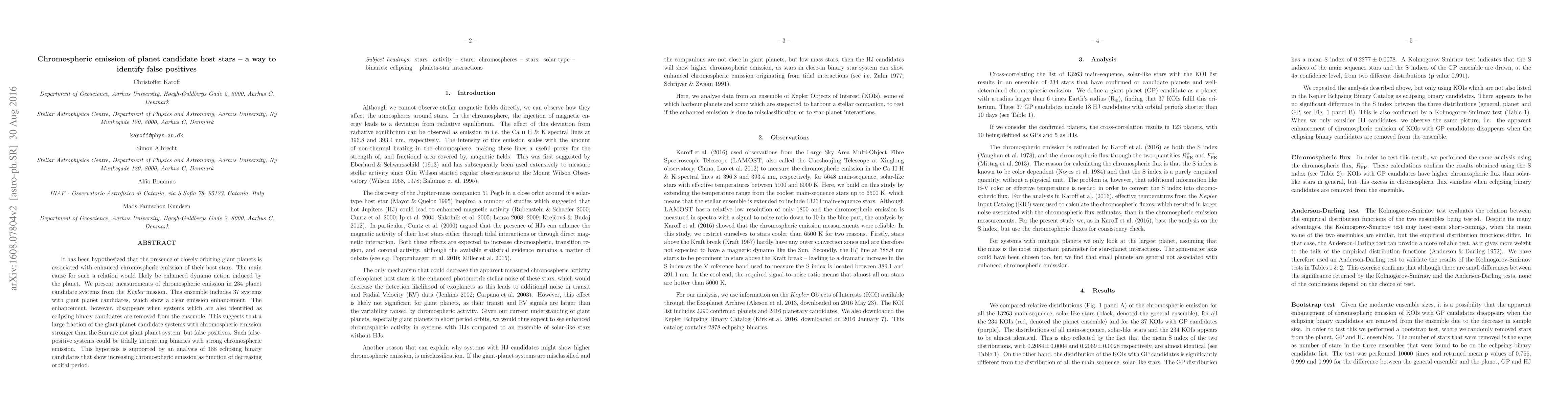 It has been hypothesized that the presence of closely orbiting giant planets is associated with enhanced chromospheric emission of their host stars. The main cause for such a relation would likely be enhanced dynamo action induced by the planet. We present measurements of chromospheric emission in 234 planet candidate systems from the Kepler mission. This ensemble includes 37 systems with giant planet candidates, which show a clear emission enhancement. The enhancement, however, disappears when systems which are also identified as eclipsing binary candidates are removed from the ensemble. This suggests that a large fraction of the giant planet candidate systems with chromospheric emission stronger than the Sun are not giant planet system, but false positives. Such false-positive systems could be tidally interacting binaries with strong chromospheric emission. This hypotesis is supported by an analysis of 188 eclipsing binary candidates that show increasing chromospheric emission as function of decreasing orbital period.