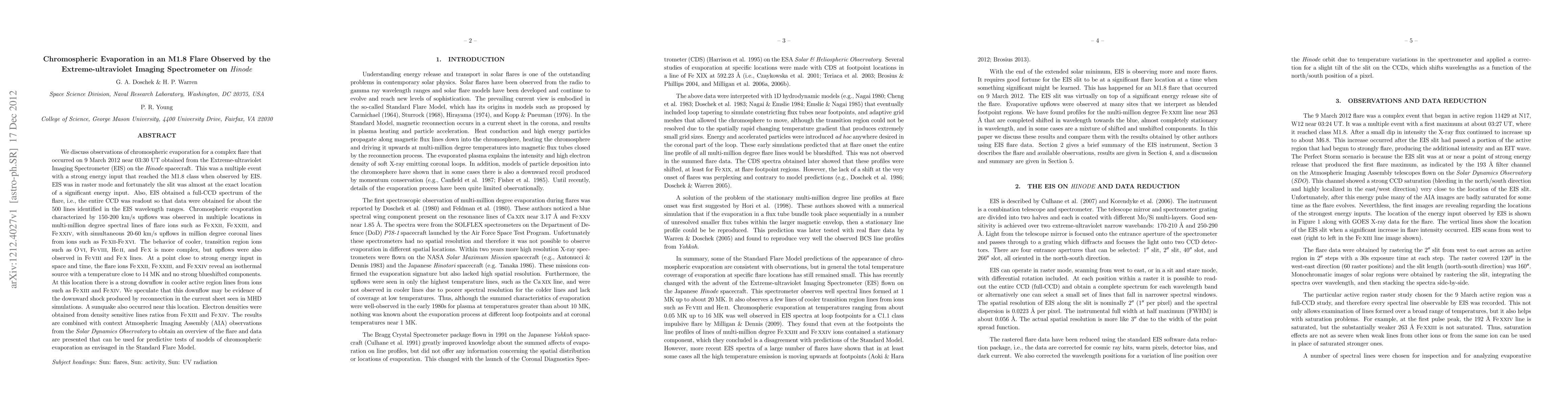 This study observes chromospheric evaporation during an M1.8 flare using Hinode's EIS, noting upflows in multi-million degree spectral lines indicative of flare ions. The analysis shows complex behavior of transition region ions, with evidence of a downward shock possibly linked to reconnection and a concurrent sunquake.
