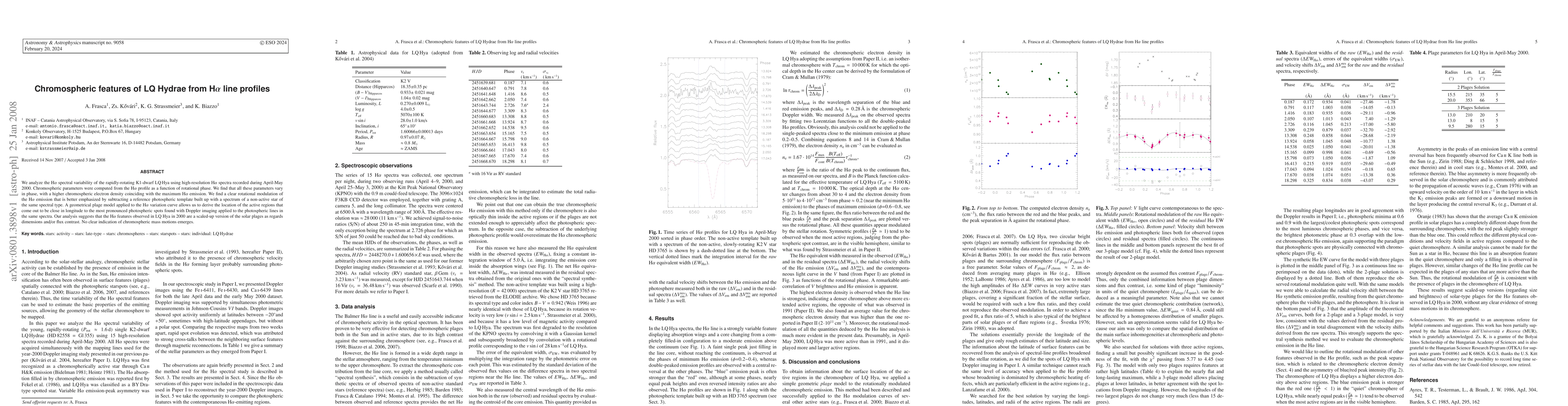 The study analyzes H-alpha line profiles of K1-dwarf star LQ Hya to track chromospheric features during 2000. It finds rotational modulation and active regions near prominent photospheric spots.