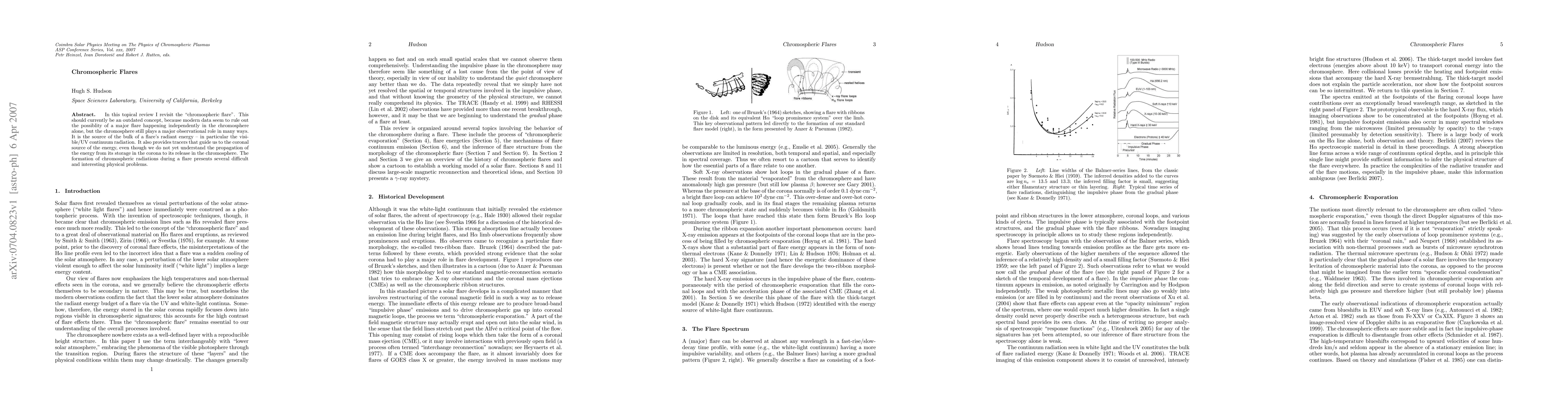 In this topical review I revisit the "chromospheric flare." This should currently be an outdated concept, because modern data seem to rule out the possiblity of a major flare happening independently in the chromosphere alone, but the chromosphere still plays a major observational role in many ways. It is the source of the bulk of a flare's radiant energy - in particular the visible/UV continuum radiation. It also provides tracers that guide us to the coronal source of the energy, even though we do not yet understand the propagation of the energy from its storage in the corona to its release in the chromosphere. The formation of chromospheric radiations during a flare presents several difficult and interesting physical problems.