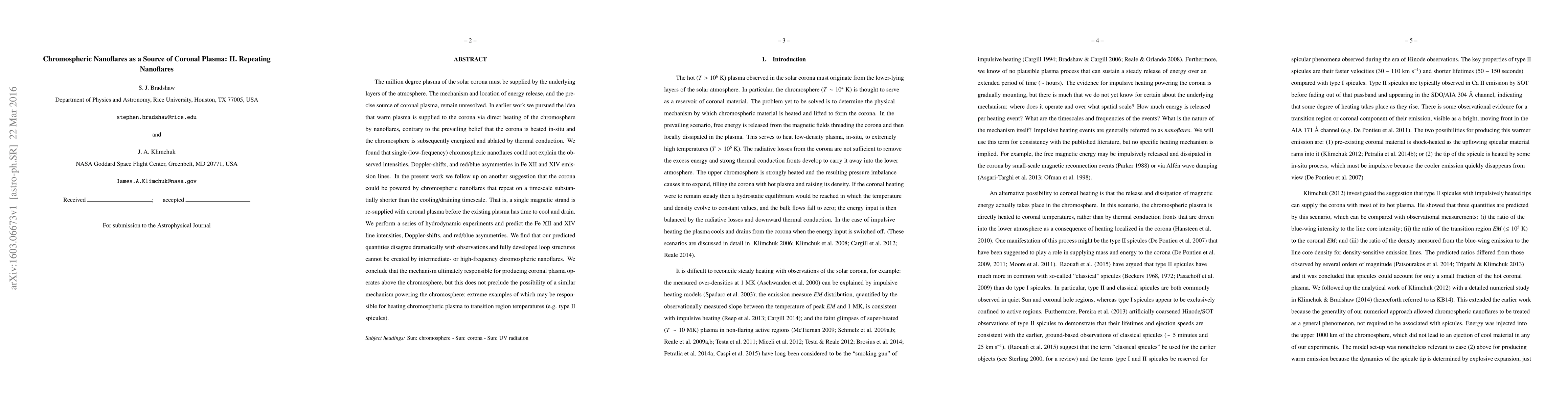 This paper explores the hypothesis that repeating chromospheric nanoflares supply the solar corona with plasma, finding that such nanoflares cannot create fully developed coronal loop structures due to discrepancies in predicted and observed Fe XII and XIV line characteristics. The study concludes that the mechanism for coronal plasma production likely operates above the chromosphere.