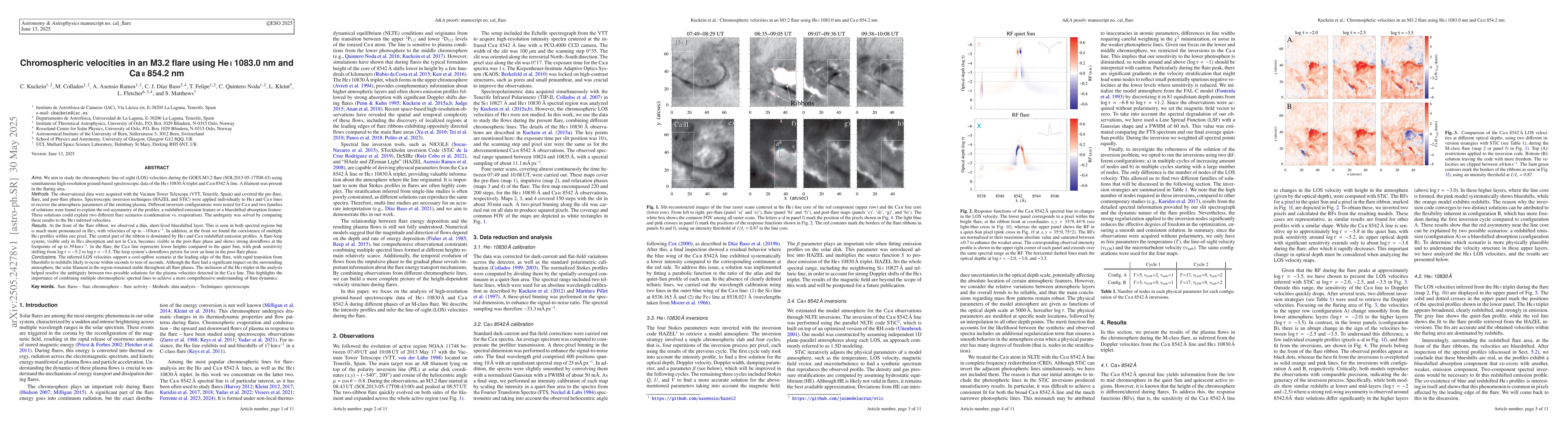 We study the chromospheric LOS velocities during the GOES M3.2 flare (SOL2013-05-17T08:43) using simultaneous spectroscopic data of the He I 1083.0 nm triplet and Ca II 854.2 nm line. A filament was present in the flaring area. The observational data were acquired with the VTT (Tenerife, Spain) and covered the pre-flare, flare, and post-flare phases. Spectroscopic inversion techniques (HAZEL and STiC) were applied individually to He I and Ca II lines to recover the atmospheric parameters. Different inversion configurations were tested for Ca II and two families of solutions were found to explain the red asymmetry of the profiles: a redshifted emission feature or a blueshifted absorption feature. These solutions could explain two different flare scenarios (condensation vs. evaporation). The ambiguity was solved by comparing these results to the He I inferred velocities. At the front of the flare ribbon, we observed a thin, short-lived blueshifted layer. This is seen in both spectral regions but is much more pronounced in He I, with velocities of up to -10 km/s. In addition, at the front we found the coexistence of multiple He I profiles within one pixel. The central part of the ribbon is dominated by He I and Ca II redshifted emission profiles. A flare-loop system, visible only in He I absorption and not in Ca II, becomes visible in the post-flare phase and shows strong downflows at the footpoints of up to 39 km/s. In the flare, the Ca II line represents lower heights compared to the quiet Sun, with peak sensitivity shifting from $\log \tau \simeq -5.2$ to $\log \tau \simeq -3.5$. The inferred LOS velocities support a cool-upflow scenario at the leading edge of the flare. The solar filament in the region remained stable. The inclusion of the He I triplet in the analysis helped resolve the ambiguity between two possible solutions for the plasma velocities detected in the Ca II line.
