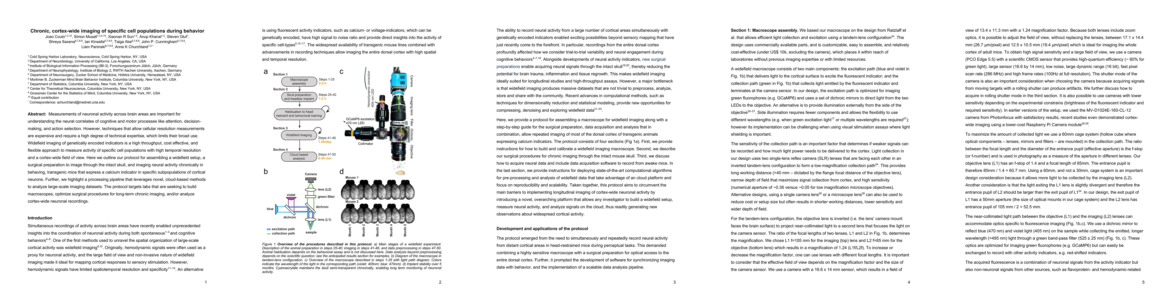 Measurements of neuronal activity across brain areas are important for understanding the neural correlates of cognitive and motor processes like attention, decision-making, and action selection. However, techniques that allow cellular resolution measurements are expensive and require a high degree of technical expertise, which limits their broad use. Widefield imaging of genetically encoded indicators is a high throughput, cost effective, and flexible approach to measure activity of specific cell populations with high temporal resolution and a cortex-wide field of view. Here we outline our protocol for assembling a widefield setup, a surgical preparation to image through the intact skull, and imaging neural activity chronically in behaving, transgenic mice that express a calcium indicator in specific subpopulations of cortical neurons. Further, we highlight a processing pipeline that leverages novel, cloud-based methods to analyze large-scale imaging datasets. The protocol targets labs that are seeking to build macroscopes, optimize surgical procedures for long-term chronic imaging, and/or analyze cortex-wide neuronal recordings.