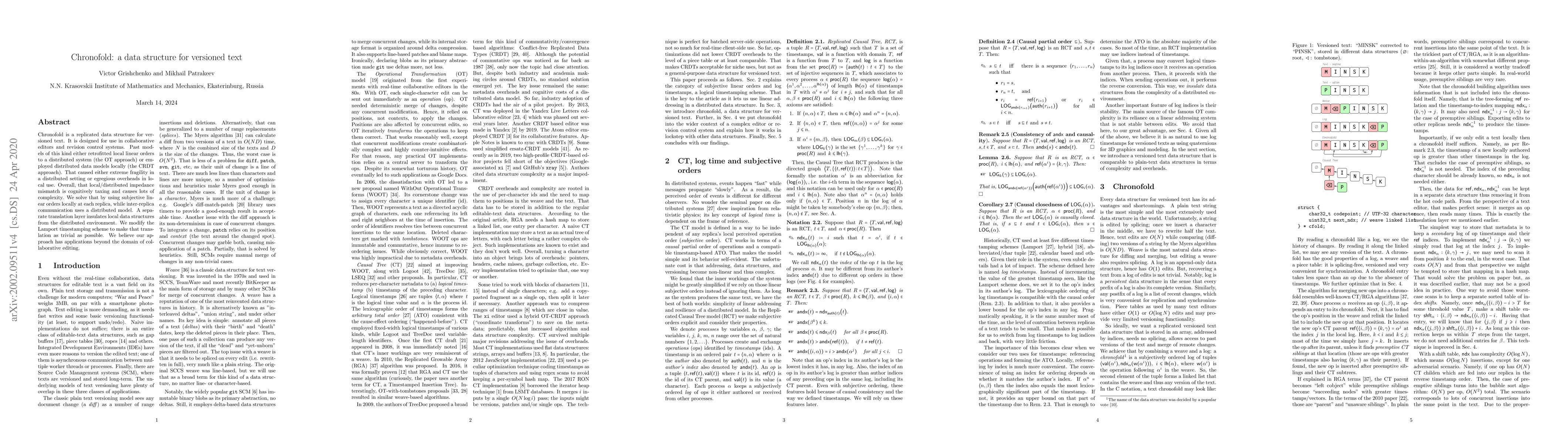 Chronofold is a novel replicated data structure for versioned text that uses subjective linear orders locally and a distributed model for inter-replica communication, addressing the local/distributed impedance mismatch. It employs a translation layer and a modified Lamport timestamping scheme for seamless integration, aiming to simplify collaborative editing and revision control.