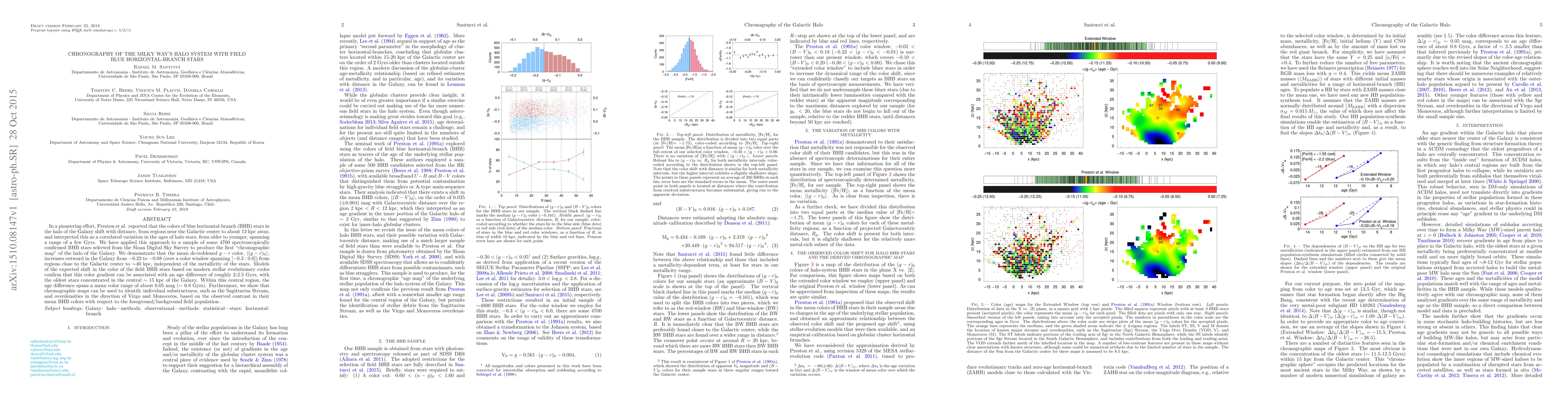 This study presents the first 'chronographic map' of the Milky Way's halo, revealing that the mean color of field blue horizontal-branch stars increases with distance from the Galactic center. This color gradient, confirmed by stellar evolution models, suggests an age difference of 2-2.5 Gyrs, with older stars concentrated in the central 15 kpc. The method also identifies substructures like the Sagittarius Stream and overdensities in Virgo and Monoceros based on distinct BHB colors.