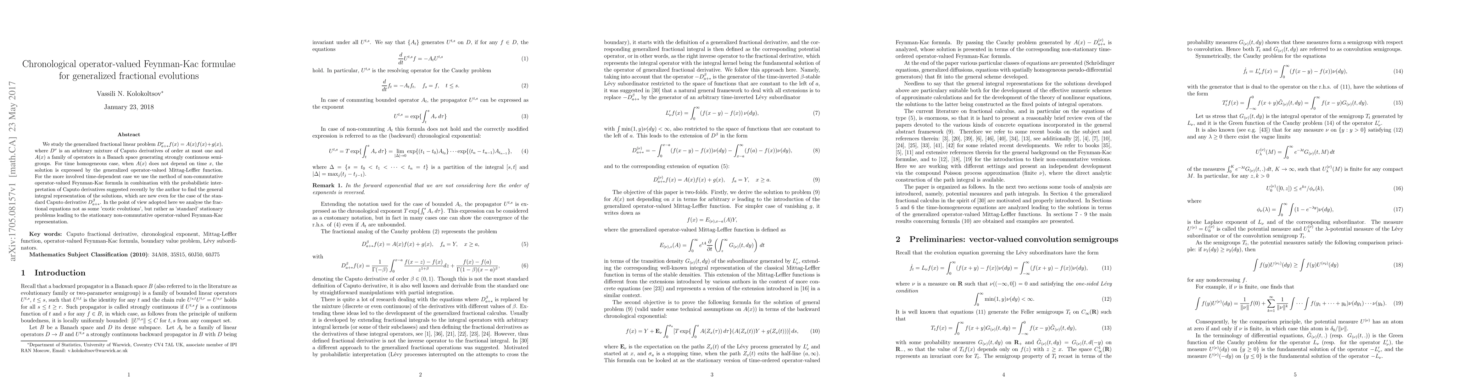 This paper investigates generalized fractional evolution problems using a mixture of Caputo derivatives and operator-valued Feynman-Kac formulae. The authors derive a solution for the time-homogeneous case using the generalized operator-valued Mittag-Leffler function, and introduce a new integral representation for the time-dependent case.