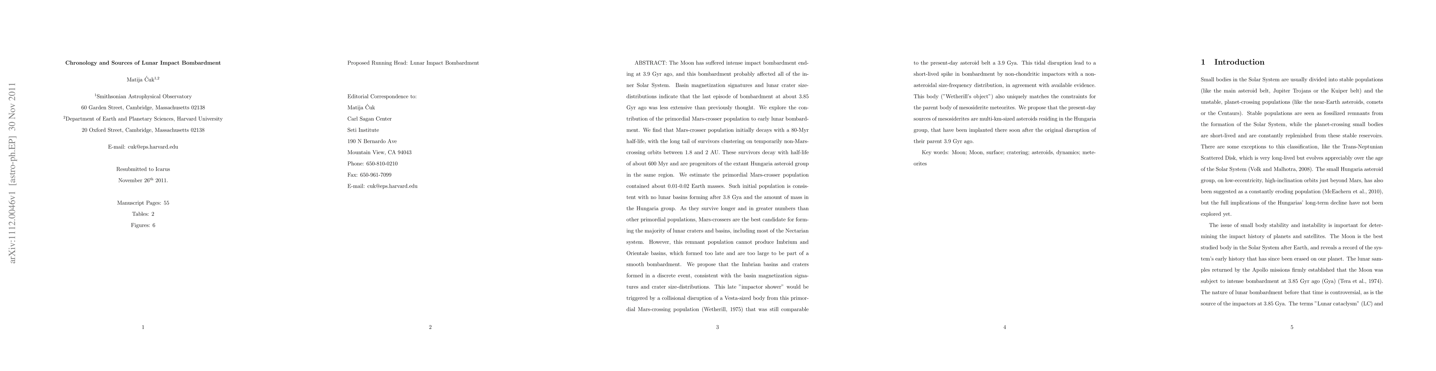 This paper investigates the timeline and source of lunar impact bombardment, concluding that Mars-crosser asteroids were the primary contributors to early lunar craters and basins. The study suggests a late "impactor shower" caused by the tidal disruption of a Vesta-sized body led to the formation of the Imbrian basins, a discrete event distinct from the earlier smooth bombardment.