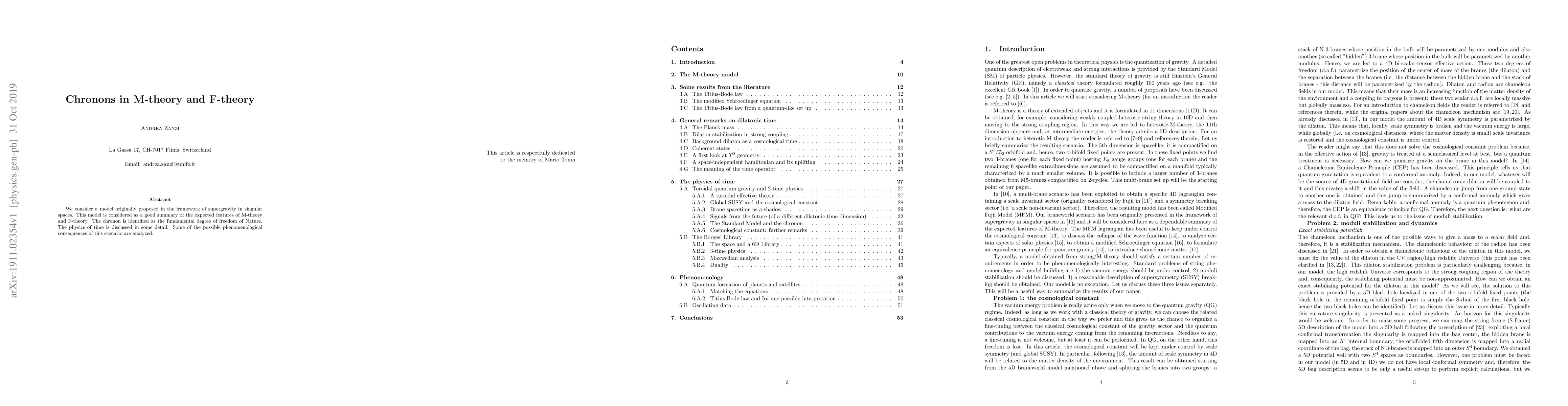 We consider a model originally proposed in the framework of supergravity in singular spaces. This model is considered as a good summary of the expected features of M-theory and F-theory. The chronon is identified as the fundamental degree of freedom of Nature. The physics of time is discussed in some detail. Some of the possible phenomenological consequences of this scenario are analyzed.