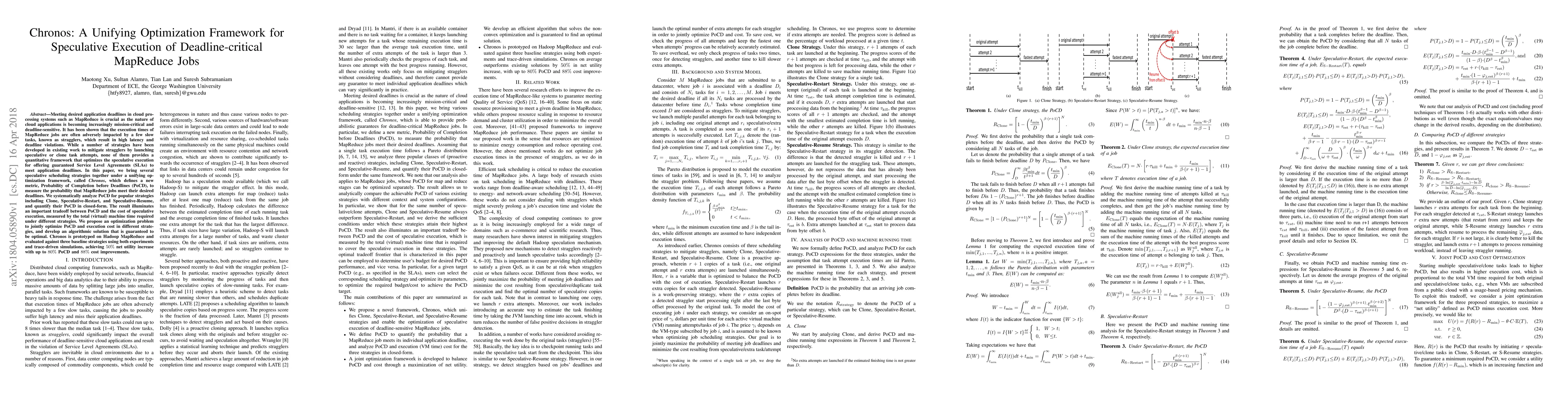 This paper introduces Chronos, a unifying optimization framework for speculative execution of deadline-critical MapReduce jobs, aiming to mitigate stragglers and ensure application deadlines. It proposes a new metric, Probability of Completion before Deadlines (PoCD), and an optimization problem to balance PoCD and execution cost, achieving significant improvements in utility and cost reduction.