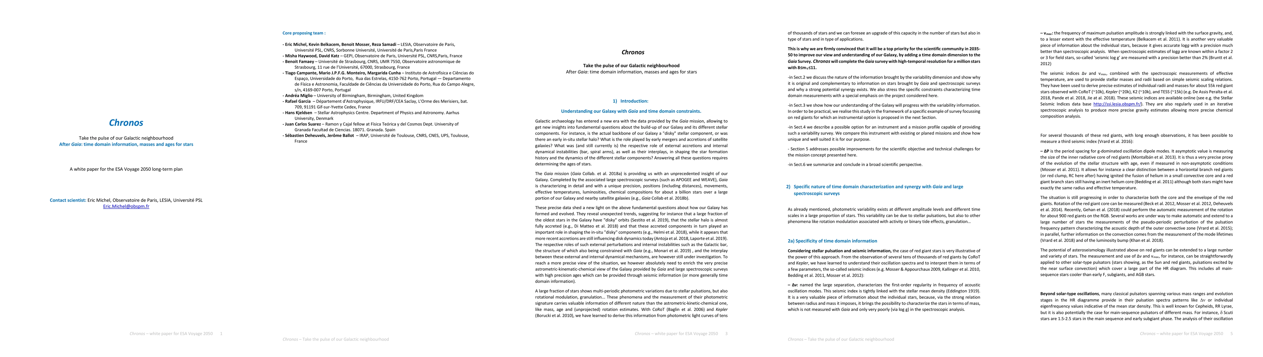 The period 2035-50 considered in the ESA Voyage long-term plan will coincide with a series of foreseeable advances in the characterization of the stellar content of the Milky Way. The Gaia mission, combined with large-scale spectroscopic surveys, is helping to build an unprecedented census in terms of the astrometric, kinematic and chemical properties of Galactic stellar populations. Within a decade, precise measurements of such properties will be available for hundreds of millions of stars. Meanwhile, time-domain surveys initiated with CoRoT and Kepler/K2 and carried on by space missions such as TESS and PLATO or ground-based projects like the LSST, will have brought asteroseismology to a high level of maturity. The combination of precise ages from asteroseismology with astrometric and spectroscopic data, on large stellar samples, is allowing Galactic archaeologists to gain new insight into the assembly history of the Milky Way. Recent breakthroughs --- based on the detection of solar-like oscillations in tens of thousands of red-giant stars --- demonstrate the potential of such approach. Therefore, we are convinced that an all-sky, high-cadence, long-duration stellar variability survey will become a scientific priority in the 2035-50 period. The Chronos concept presented here consists in a time-domain extension to Gaia. It will allow for mass and age estimates for half a million red giants within 1.7 kpc from the Sun and hence shed a new light on our understanding of the Galactic dynamics and archaeology. In terms of the targeted pulsators, Chronos will bridge the gap between PLATO and the LSST by surveying stars all the way from the subgiant branch to the early AGB. Finally, it will surpass all previous surveys capable of conducting asteroseismology in terms of the combined sky coverage and duration of the observations (2 x 3.75 months over the whole sky and >5 years in the CVZ).