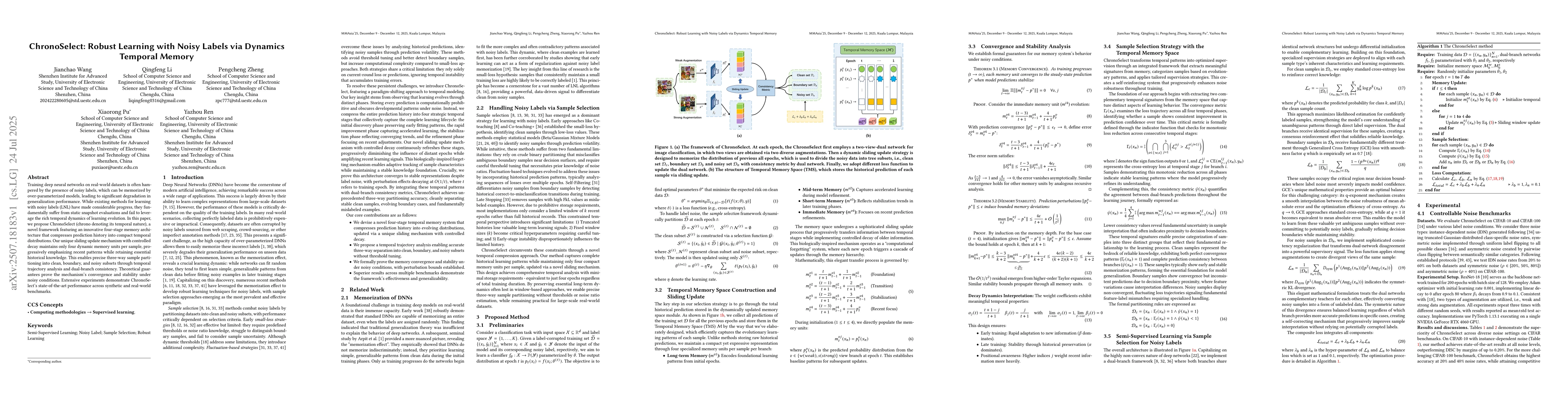 Training deep neural networks on real-world datasets is often hampered by the presence of noisy labels, which can be memorized by over-parameterized models, leading to significant degradation in generalization performance. While existing methods for learning with noisy labels (LNL) have made considerable progress, they fundamentally suffer from static snapshot evaluations and fail to leverage the rich temporal dynamics of learning evolution. In this paper, we propose ChronoSelect (chrono denoting its temporal nature), a novel framework featuring an innovative four-stage memory architecture that compresses prediction history into compact temporal distributions. Our unique sliding update mechanism with controlled decay maintains only four dynamic memory units per sample, progressively emphasizing recent patterns while retaining essential historical knowledge. This enables precise three-way sample partitioning into clean, boundary, and noisy subsets through temporal trajectory analysis and dual-branch consistency. Theoretical guarantees prove the mechanism's convergence and stability under noisy conditions. Extensive experiments demonstrate ChronoSelect's state-of-the-art performance across synthetic and real-world benchmarks.