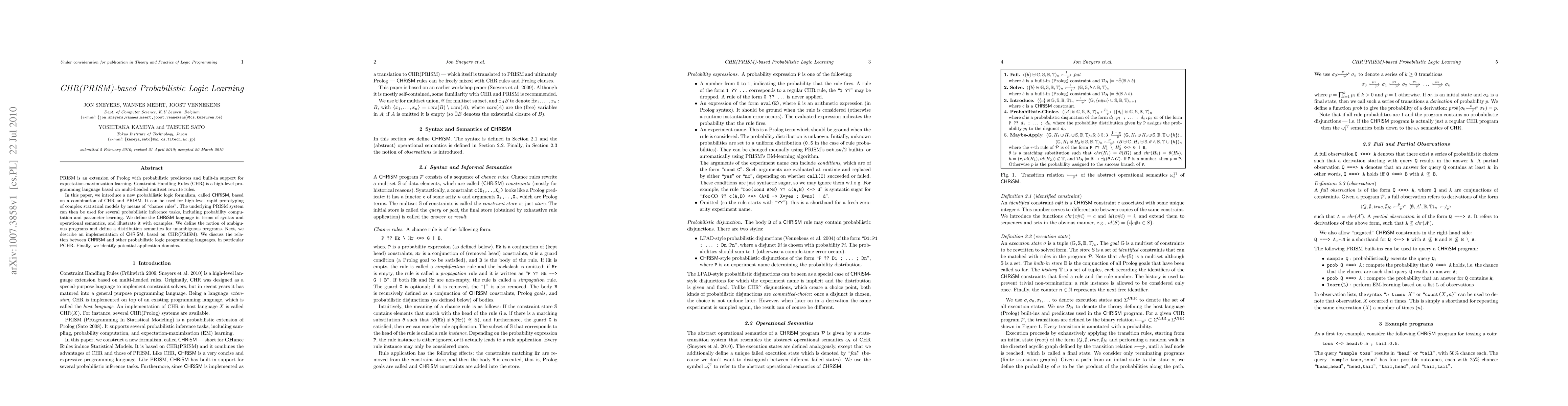 This paper introduces CHRiSM, a new probabilistic logic formalism combining CHR and PRISM, enabling high-level prototyping of complex statistical models. It leverages PRISM for probabilistic inference and defines a distribution semantics for unambiguous programs, with potential applications in various domains.
