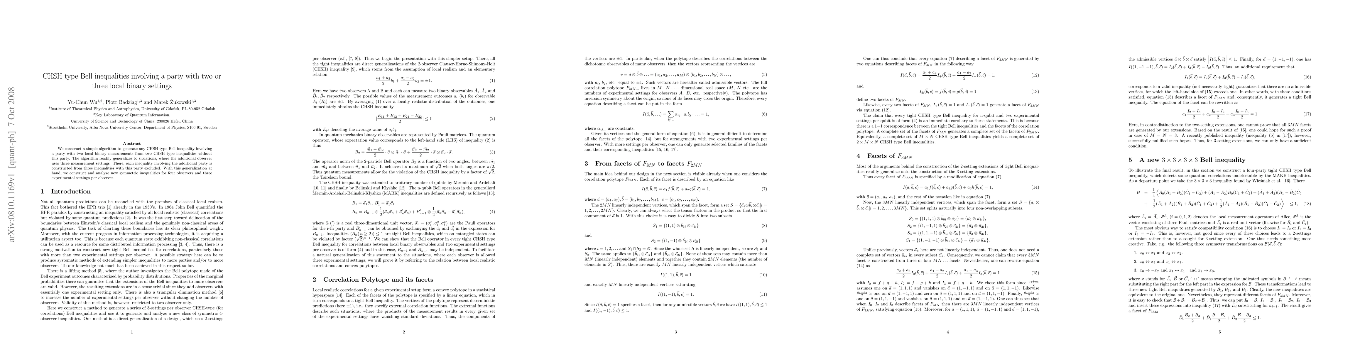 This paper presents an algorithm to generate CHSH type Bell inequalities for a party with two or three local binary settings, extending existing inequalities. It also constructs new symmetric inequalities for four observers with three settings each.
